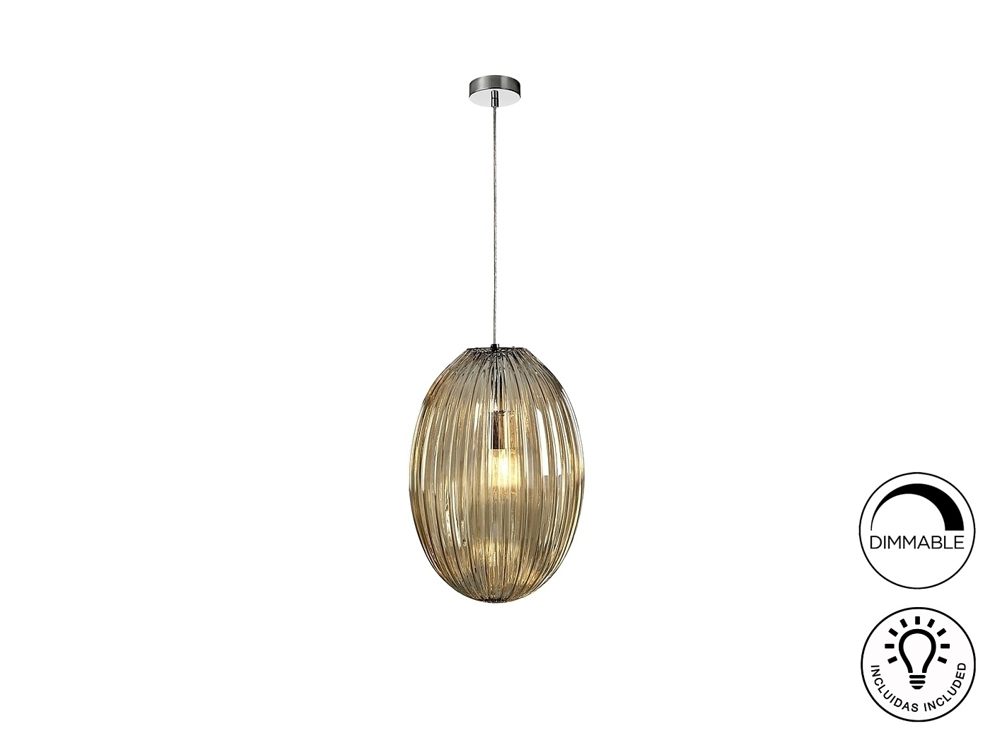 Подвесной светильник с 1 лампой, из металла с покрытием "хром". Большой плафон из стекла янтарного цвета. С регулируемой высотой. Включает 1 светодиод E27 мощностью 8 Вт. Диммируемый.