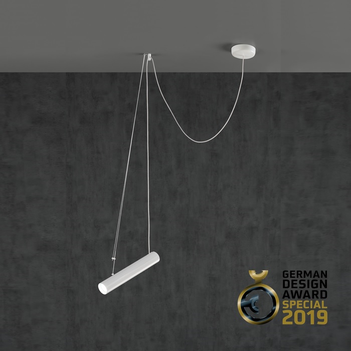 Лауреат премии "GERMAN DESIGN AWARD “в номинации” отличный дизайн продукта". Это алюминиевый цилиндрический прожектор, регулируемый голыми руками влево+вправо и вверх+вниз, чтобы фокусировать свет, когда/где это наиболее удобно, превращая пространство в полезные места в любое время.
