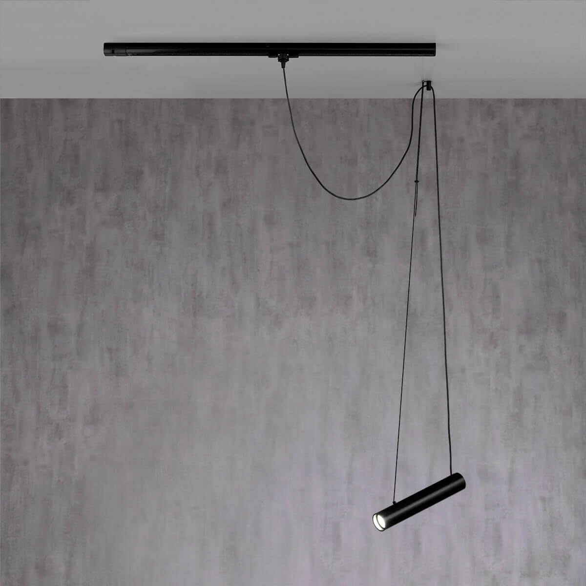 Подвесной светильник, состоящий из металлического прожектора и соединителя для шинопровода, с оригинальной системой, позволяющей направлять свет.