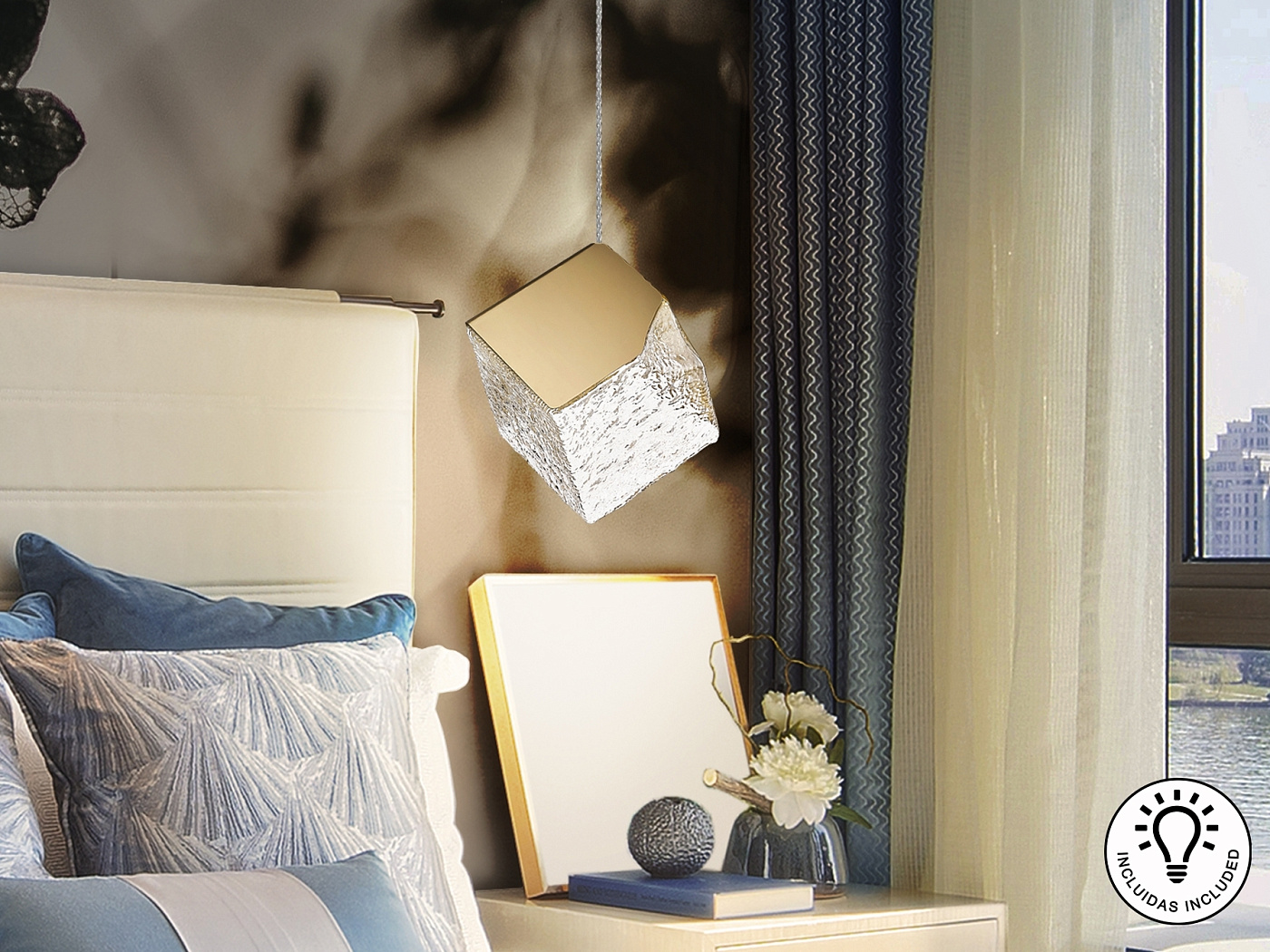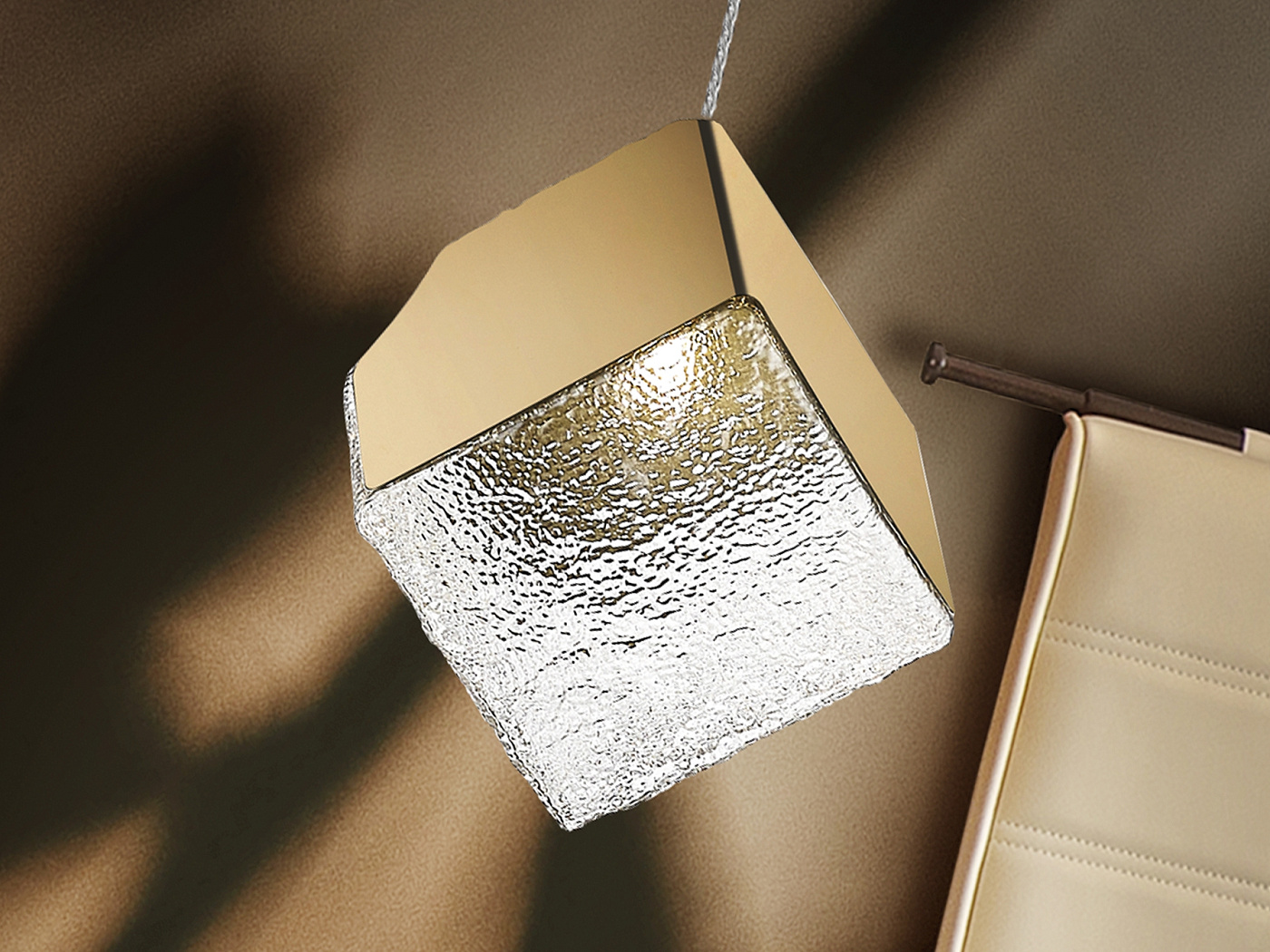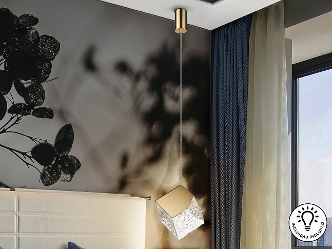 Подвес на 1 лампочку из металла и стали с отделкой под золото. Кубический абажур из фактурного стекла. Регулируется по высоте. ·Этот товар включает 1 светодиод G9 6 Вт.