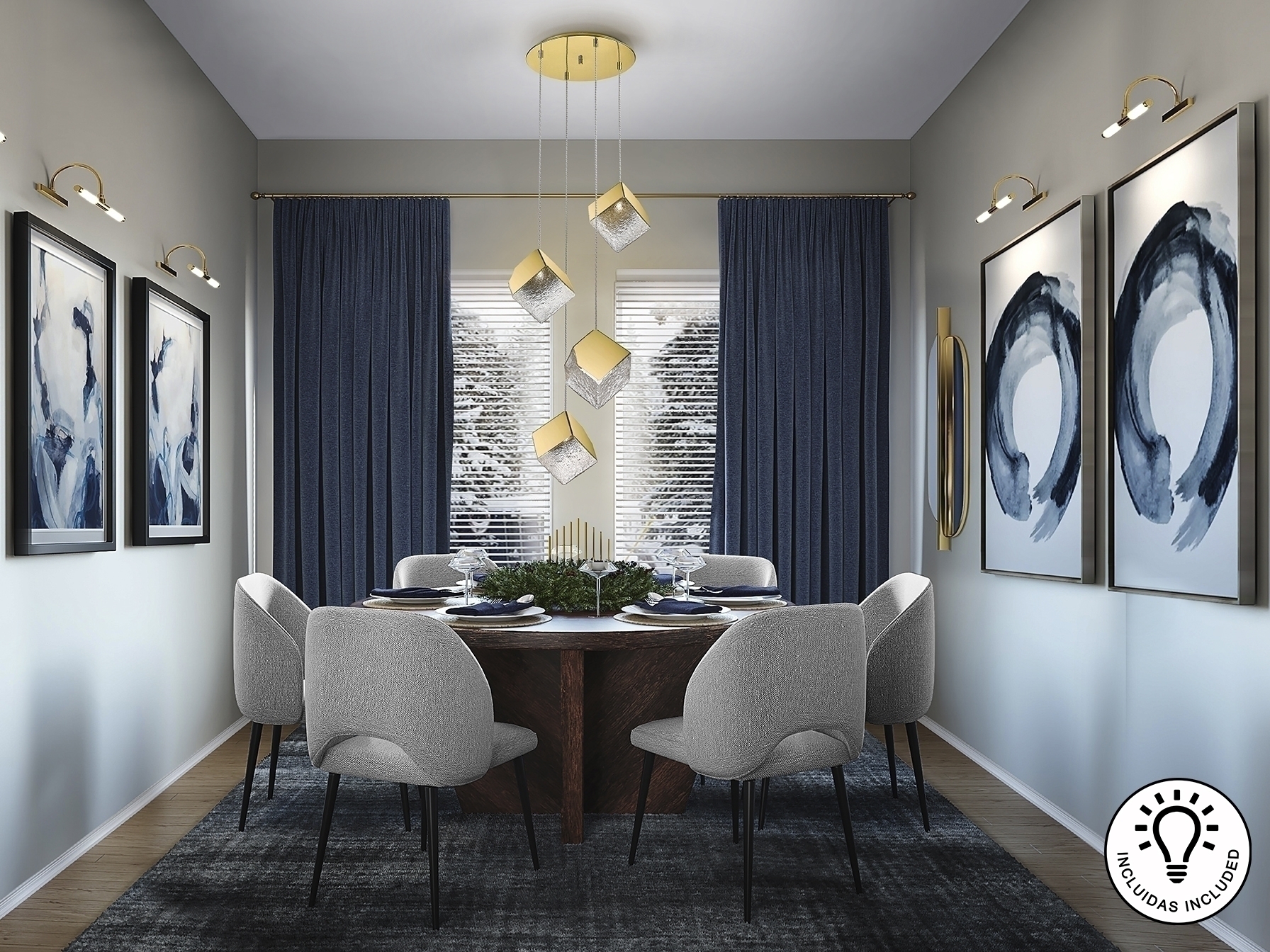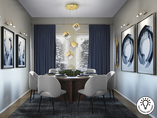 Круглая люстра из 4 ламп, изготовленная из металла и стали с отделкой из золота. Кубический абажур из фактурного стекла. Регулируется по высоте. ·Этот товар включает в себя 4 светодиода G9 6 Вт.