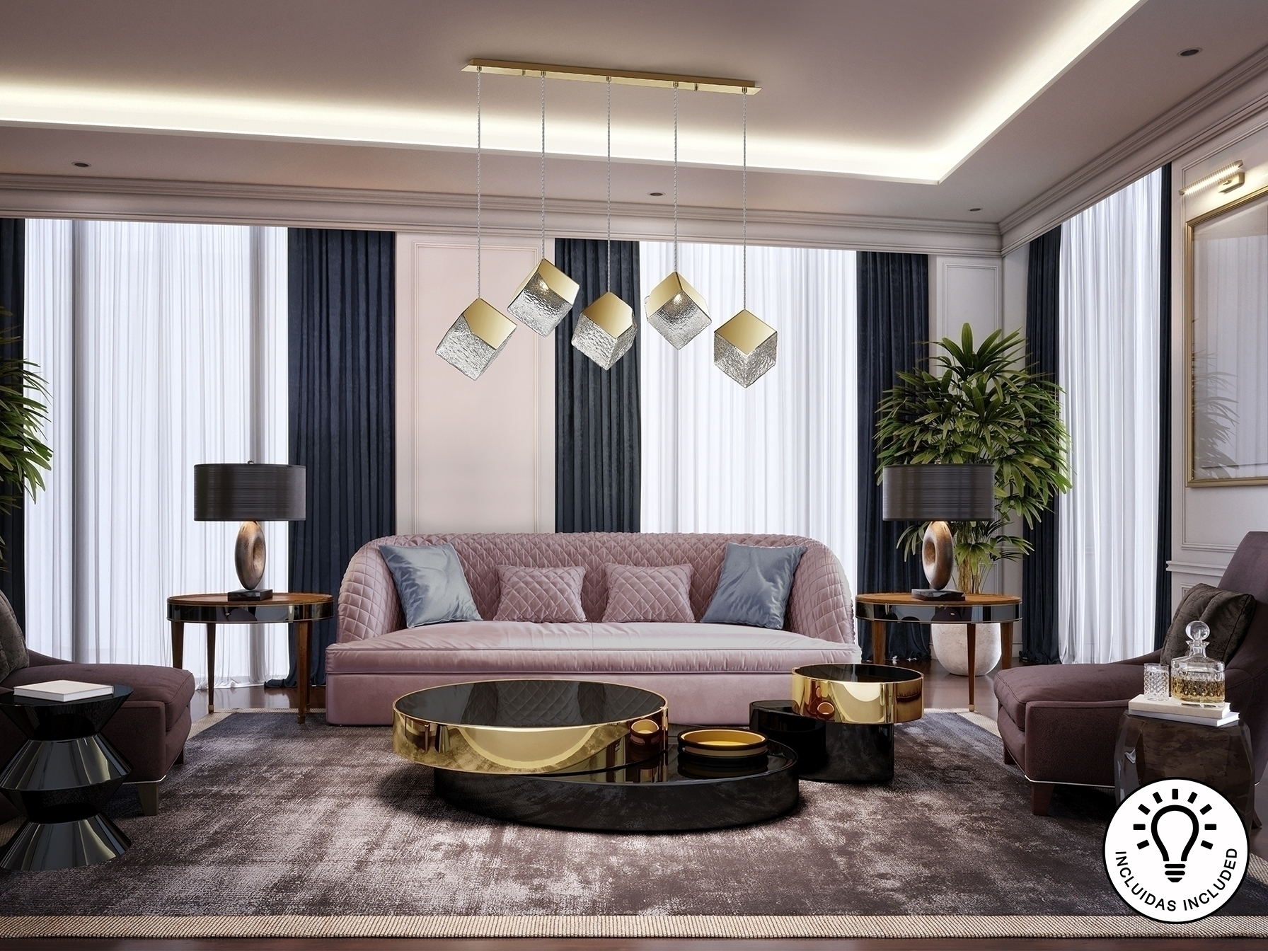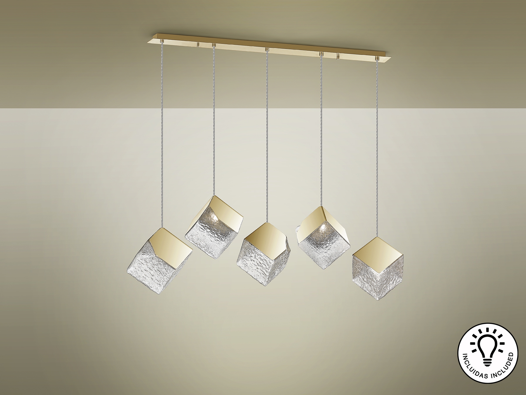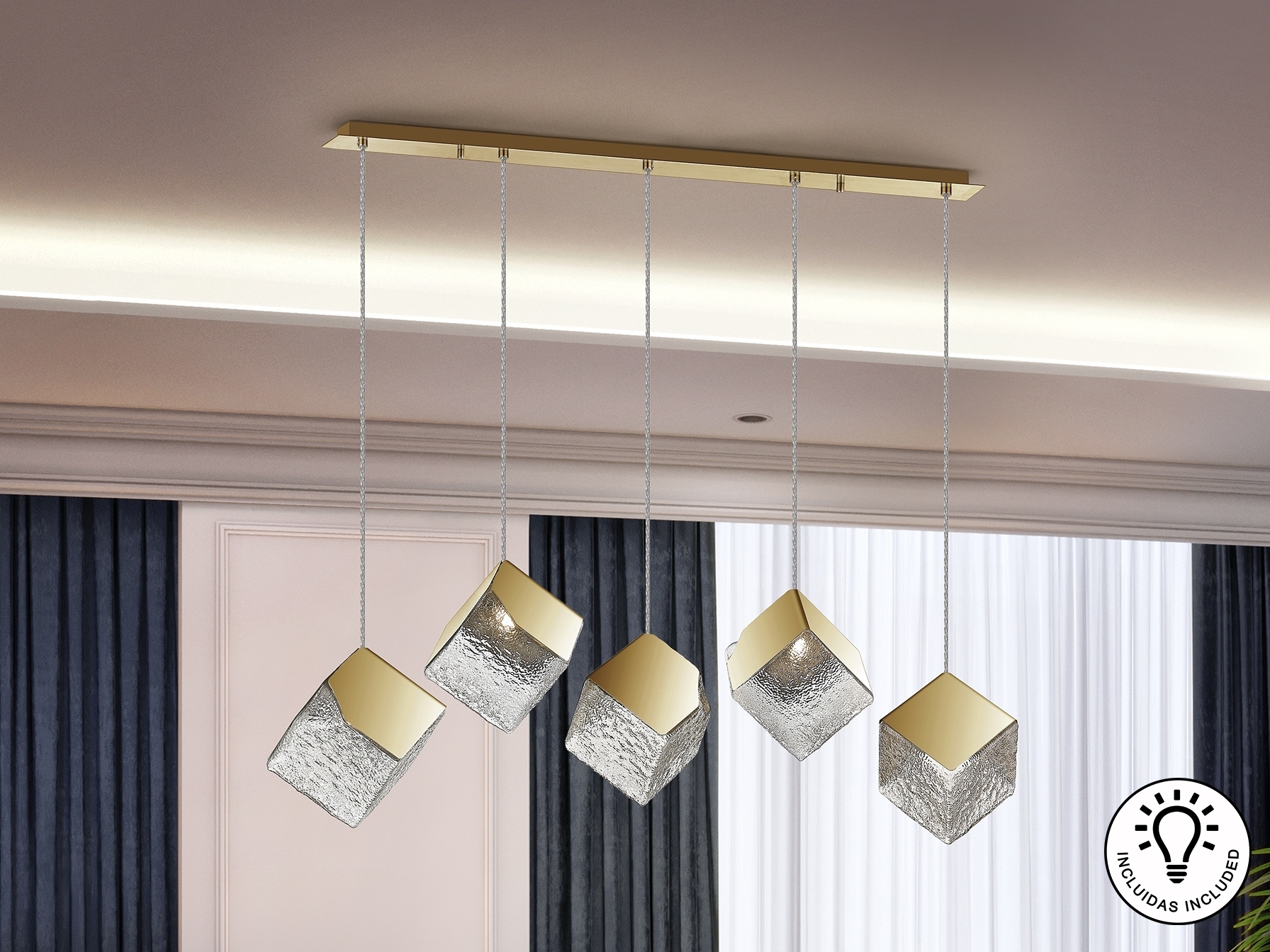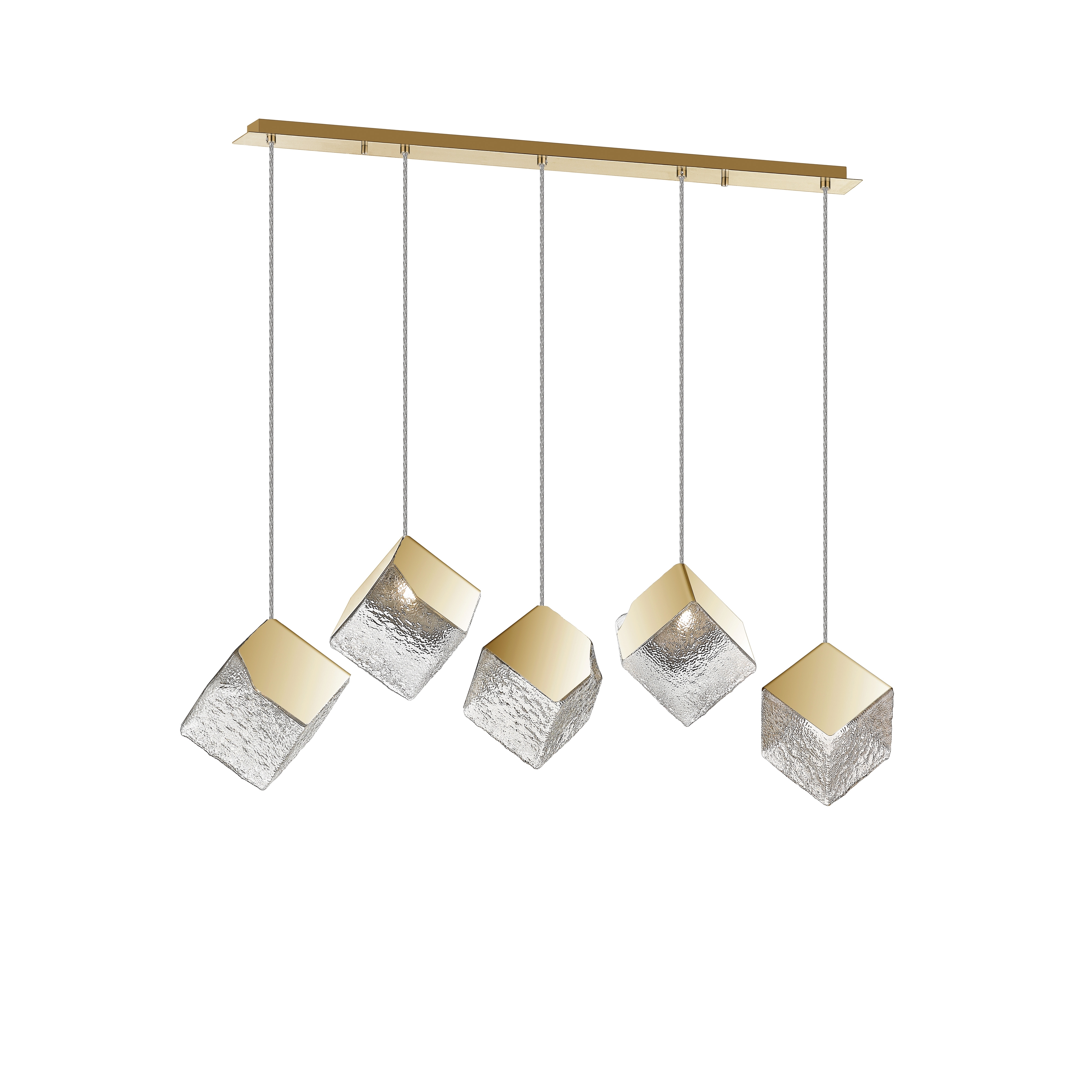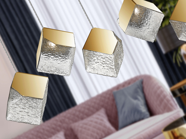 Люстра из 5 ламп, изготовлена из металла и стали, отделана золотом. Кубический абажур из фактурного стекла. Регулируется по высоте. ·Этот товар включает в себя 5 светодиодов G9 6 Вт.