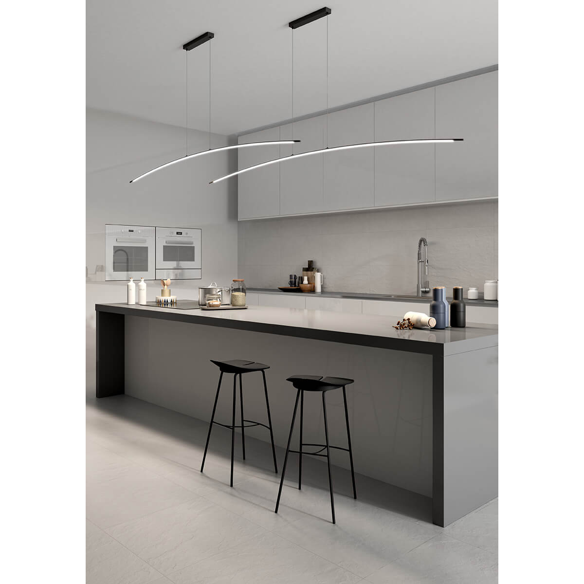 Светлые оси в различных конфигурациях конструировали с таким же алюминиевым профилем: полюсы с регулируемой поддержкой на потолке, треугольные формы, линии переменной длины, изогнутые и прямые конструкции. Легкая ориентация и регулировка высоты.