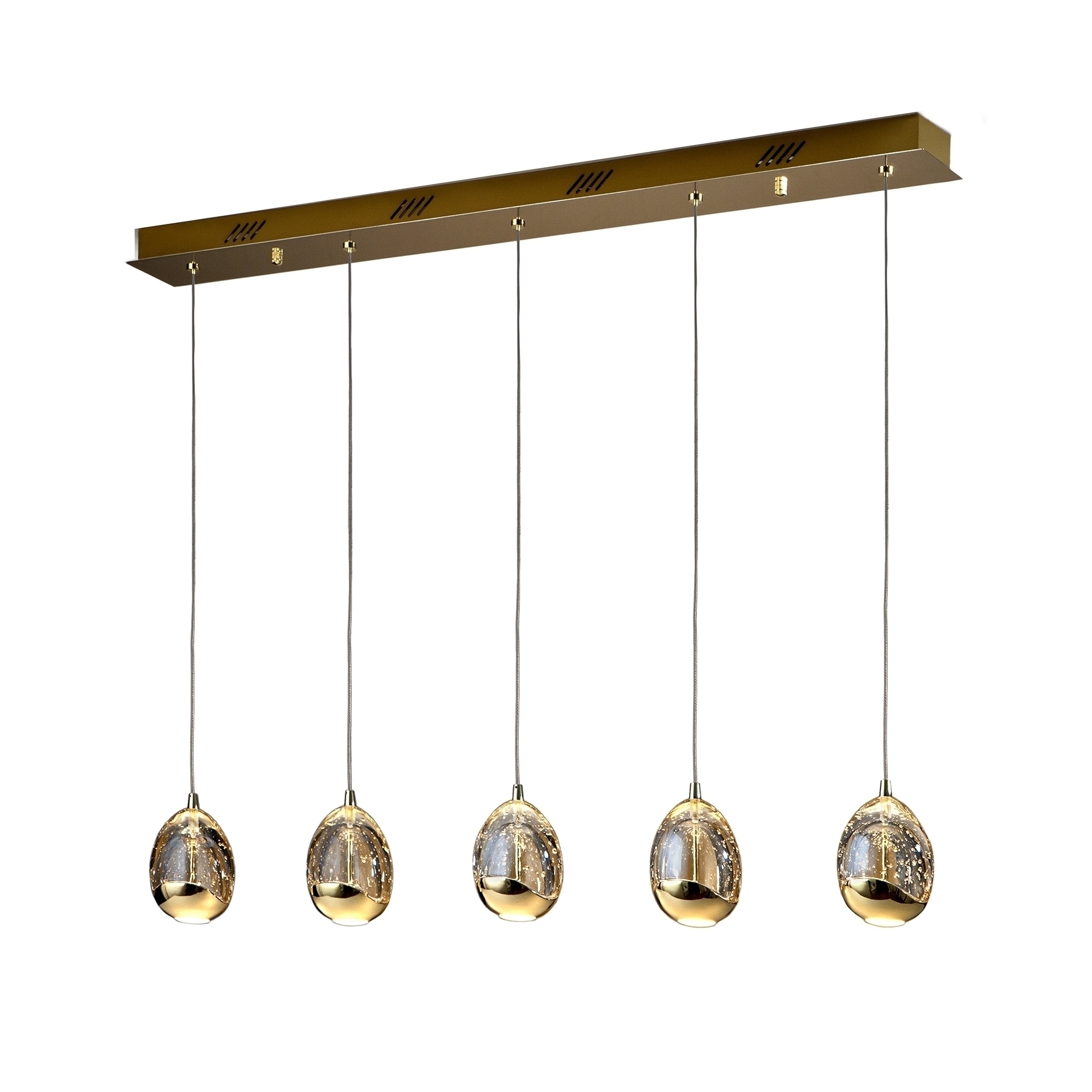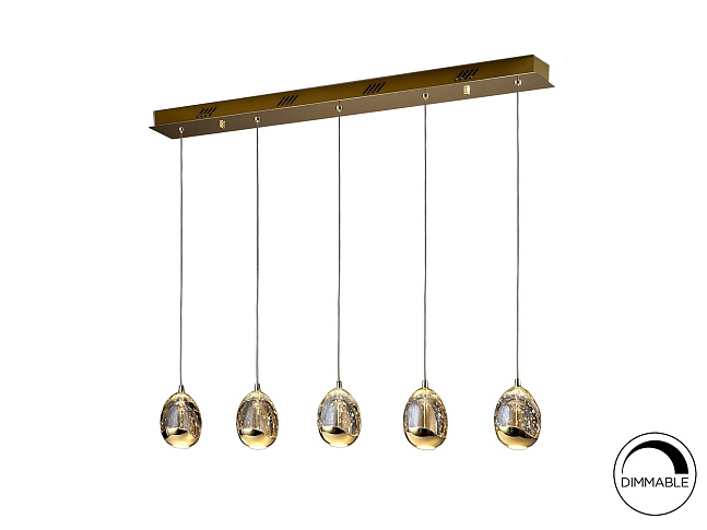 Подвесной светодиодный светильник из металла с золотистым покрытием. Плафоны в форме капли из массивного стекла цета шампань с декоративными пузырьками внутри, с регулируемой высотой. 25W LED. 2.400 lm. 3.000 K. Диммируемый. Этот продукт включает драйверы светодиодов с диммером 0-10 В или ШИМ. Для использования с настенным регулятором используйте только диммеры этих двух типов регулирования.