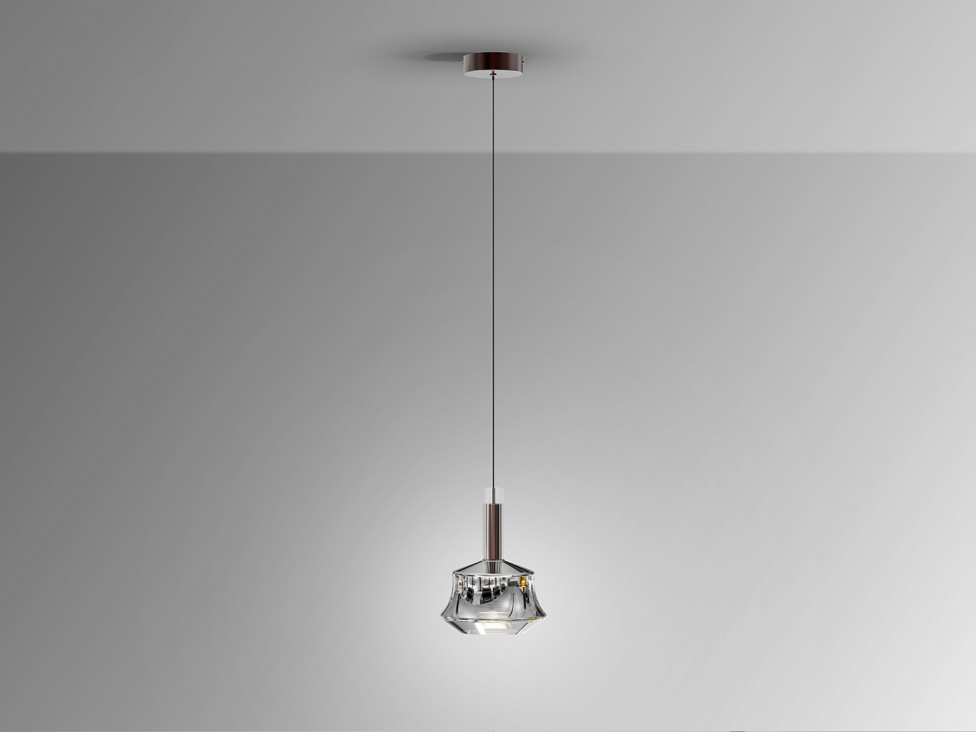 Лампа на 1 лампу из матового алюминия, отделанного в темный бронзовый тон. Абажур из электролизованного листового стекла в серебристом тоне, со светодиодной подсветкой и рассеивателем из опалового акрила. Светодиод 6 Вт, 190 лм, 3000 К · Эта лампа оснащена ГРАВИТАЦИОННЫМИ ПЕРЕКЛЮЧАТЕЛЯМИ для улучшения фиксации на потолке.