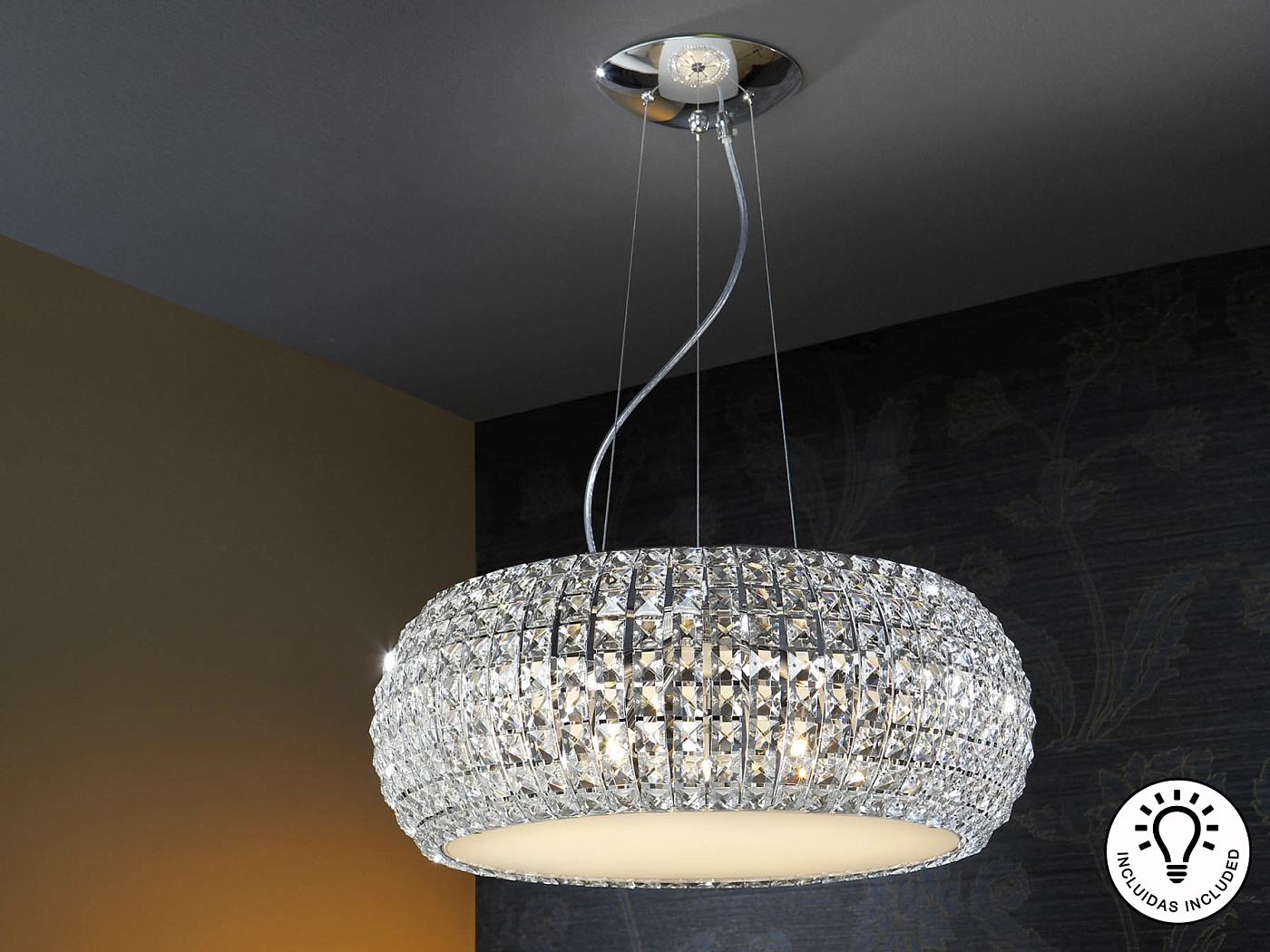 Подвесной светильник большой из металла с покрытием "хром", плафон из квадратных кристаллов из прозрачного стекла, нижний рассеиватель из стекла опалового цвета. Включает 9 светодиодов G9 мощностью 6 Вт.