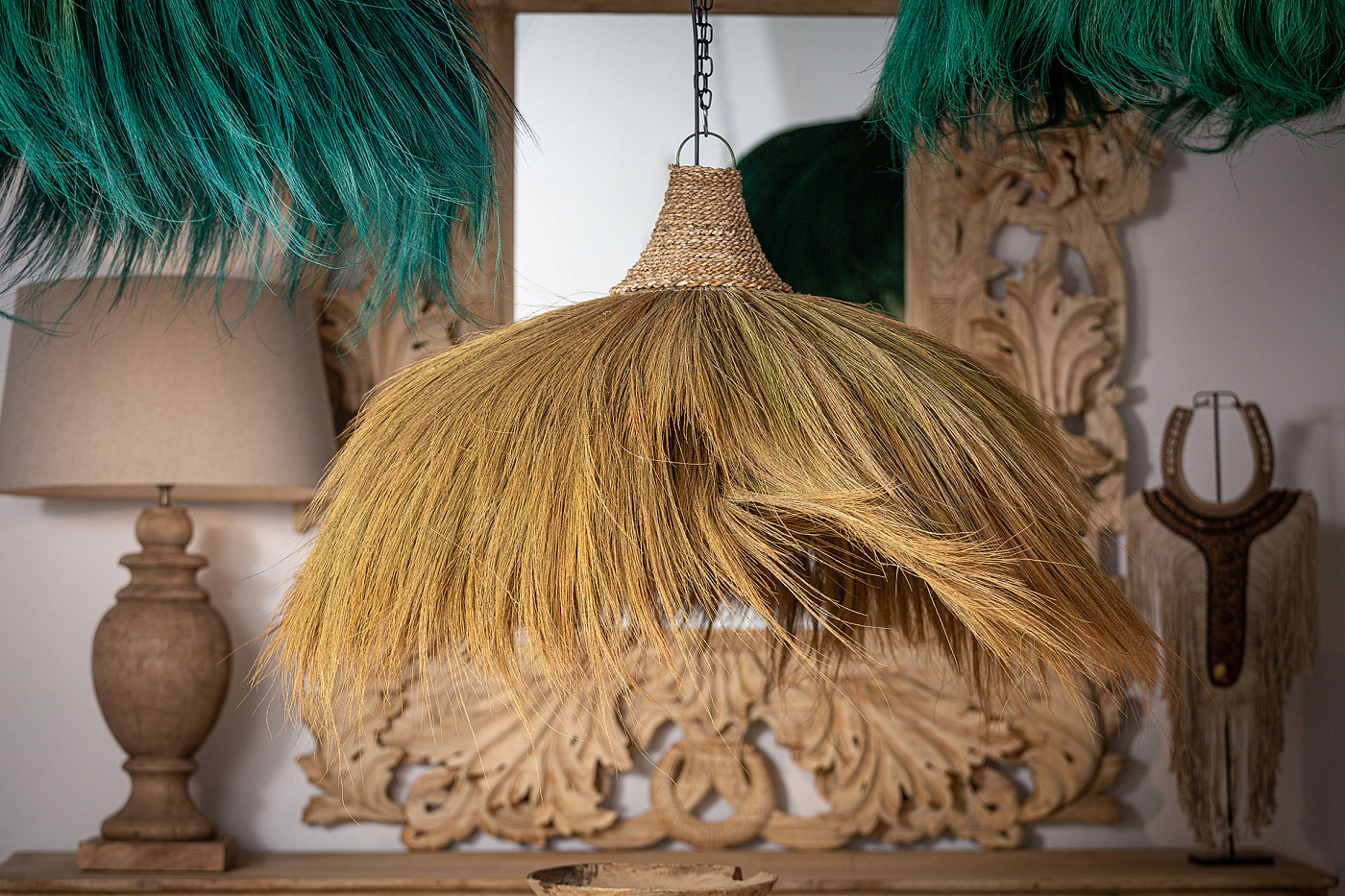 Подвесной светильник Sinko в этническом стиле, изготовлен из натурального волокна коричневого цвета в сочетании с железом.