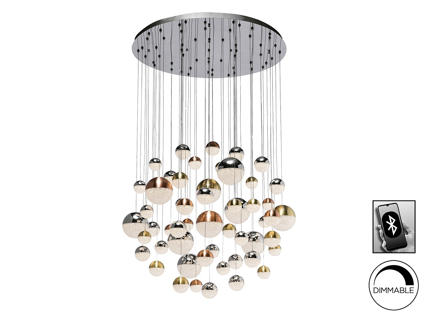 Лампа БОЛЬШОГО ФОРМАТА из хромированного металла, 55 светодиодов. Абажуры Ø10, 12 и 20 см, из поликарбоната, текстурированная внутренняя часть и металл из меди, сатинированной латуни и хрома. С УСТРОЙСТВОМ BLUETOOTH, с приложением для смартфона. Светодиод 288Вт, 3000K, 18720 лм. Включает светодиодный драйвер с диммером Bluetooth для использования через мобильное приложение или планшет. Также через интеллектуальный динамик, такой как Google Home или Amazon Echo, если добавлено устройство Bluetooth Gateway. Он несовместим с настенным регулятором. Регулируемая высота абажура для различных презентаций. Эта лампа также изготавливается в специальных размерах и отделках. Уточняйте цену и сроки доставки.