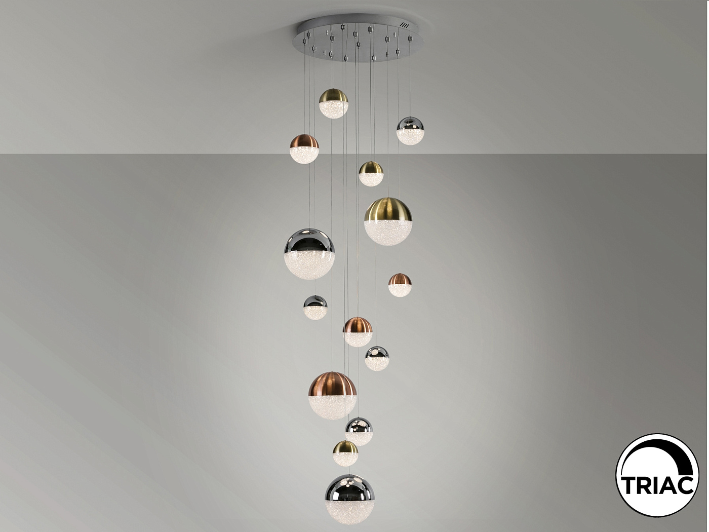 Подвесной светильник с 14 лампами LED, из хромированного металла. Шарообразные плафоны Ø10, 12, 20 из фактурного внутри поликарбоната и металла с покр."сат.медь", "сат.латунь", "хром". С регулир.высотой, макс.выс. 500 см. 78,6W LED, 5502 Lm, 3000 K.
