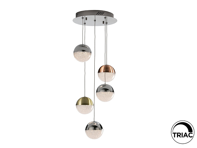 Подвесной светильник LED из металла с 5 лампами, покрытие "хром". Плафоны сферические 12Ø см из поликарбоната с фактурной внутр.поверхностью и металла с сатин. покрытием "медь" и "латунь", с покр. "хром", с регул.высотой, 24W LED, 1440 Lm, 3000 K. Этот продукт включает драйверы светодиодов с диммером 0-10 В или ШИМ. Для использования с настенным регулятором используйте только диммеры этих двух типов регулирования. Диммер другого типа может повредить драйвер светодиода.