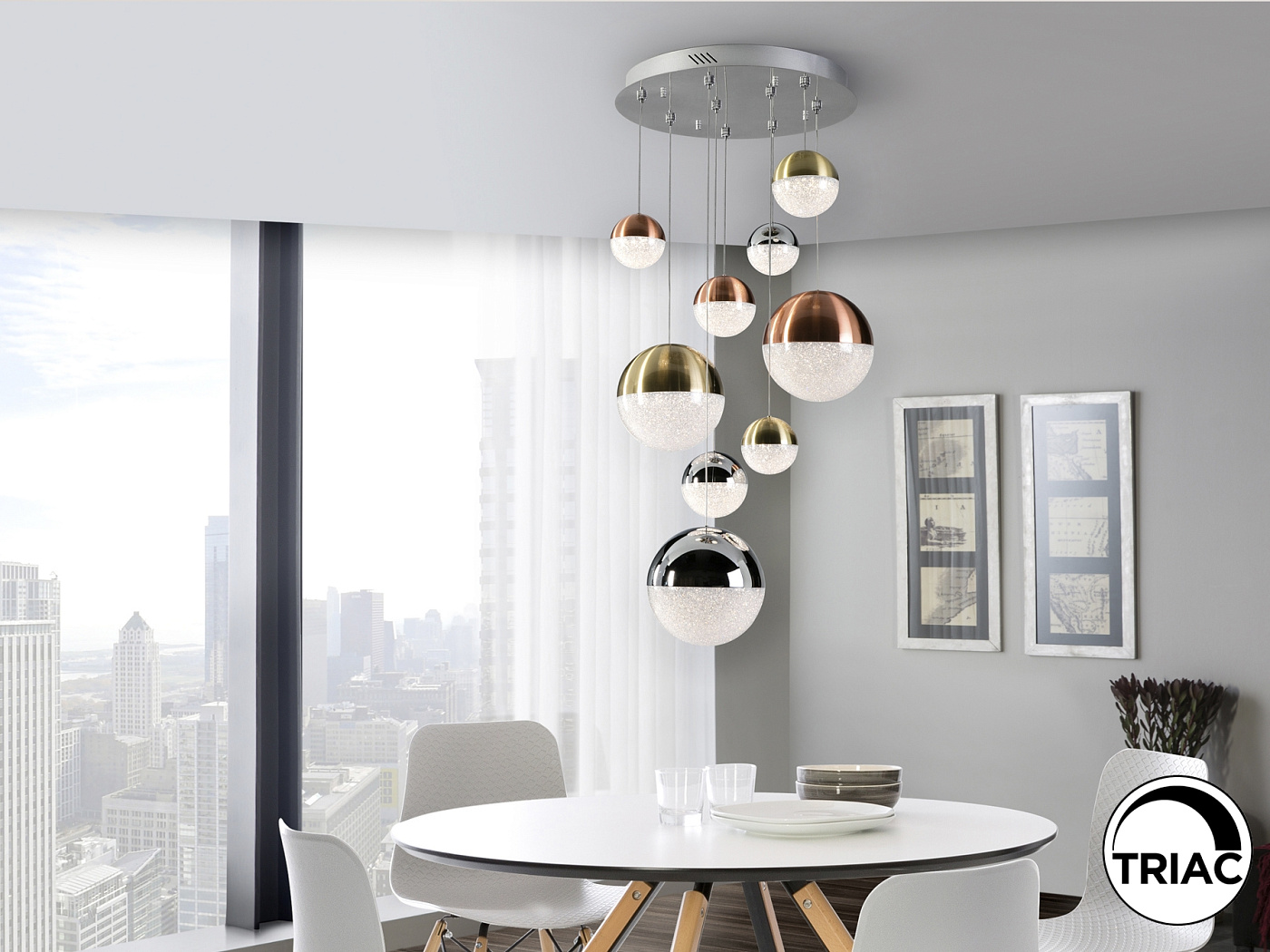 Подвесной свет.LED с 9 лампами, из металла с покр."хром", плафоны сферич. Ø10, 12Ø, Ø20 см из поликарбоната с фактурной внутр.поверхностью и металла с сатин.покрытием "медь" и "латунь", "хром", с регул.высотой,54W LED, 3780Lm, 3000K. Димм., пульт ДУ.