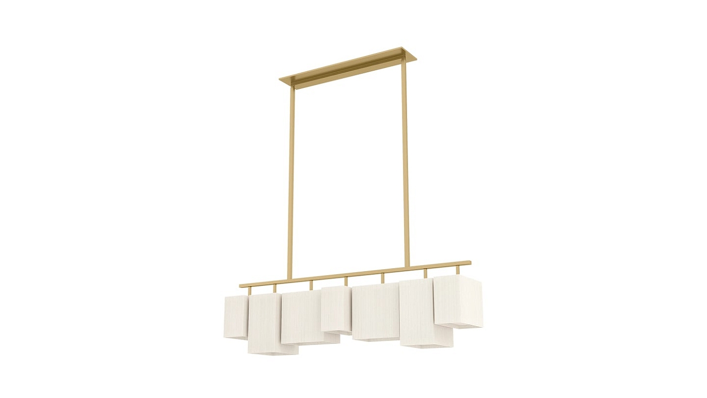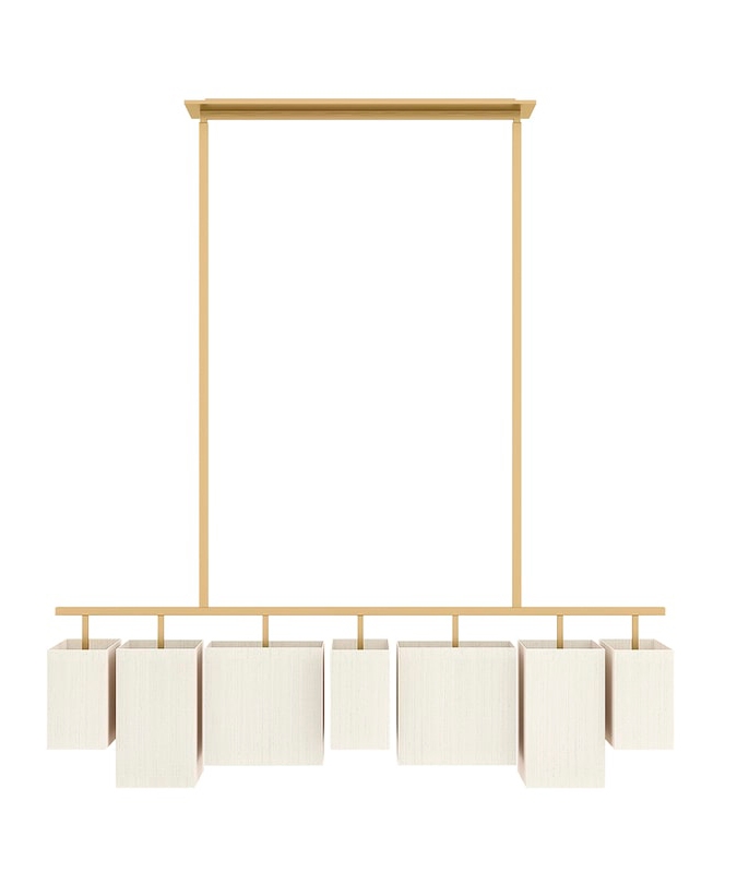 Современный потолочный светильник стильного дизайна TALIS подвешен на простой конструкции из матовой латуни. В нем подвешены семь плафонов из двойного шелка трех различных кубовидных форм, каждый с рассеивателем для рассеивания мягкого освещения.