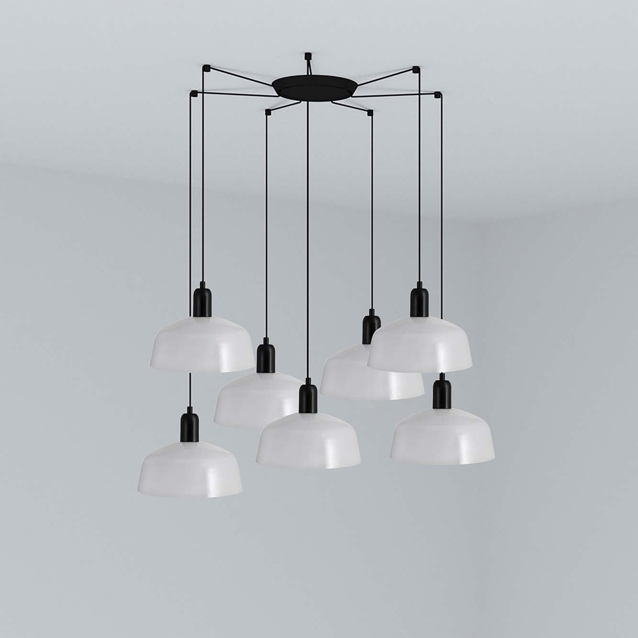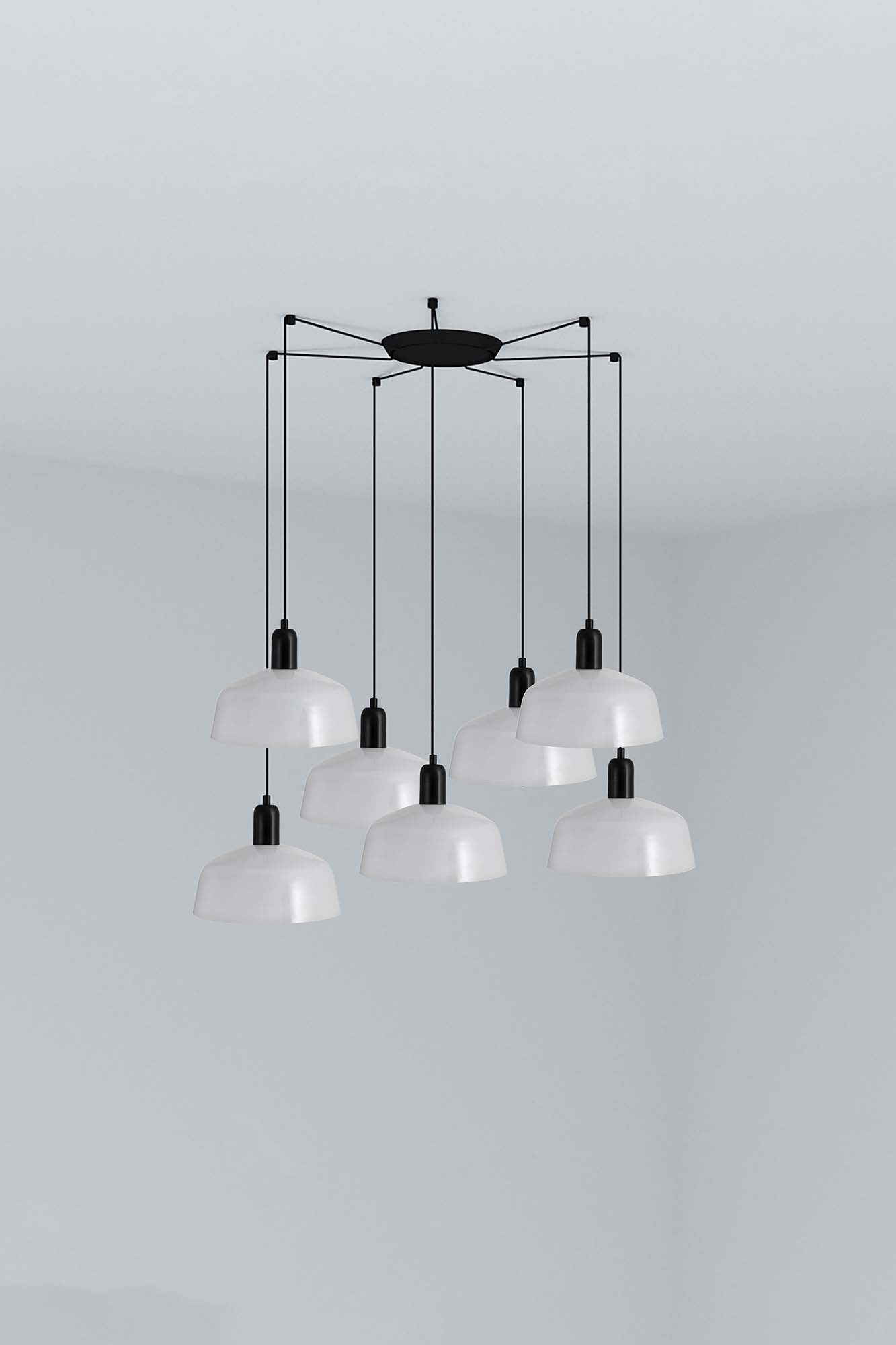 TATAWIN — это серия светильников, разработанная Адольфо Абейоном. Форма абажура напоминает верхнюю часть характерных домов Татауина, города, расположенного на юго-востоке Туниса. Этот подвесной светильник с черной конструкцией состоит из белого металлического абажура, который обеспечивает направленный свет.