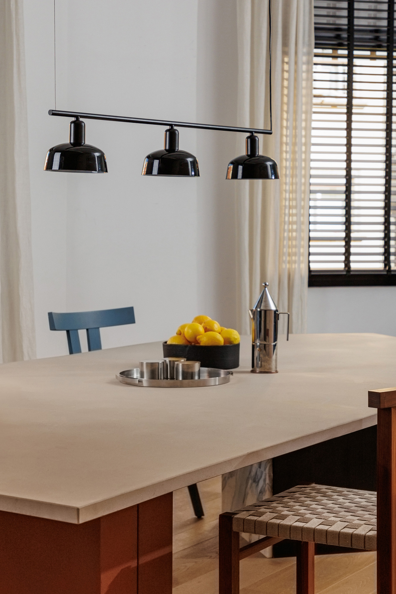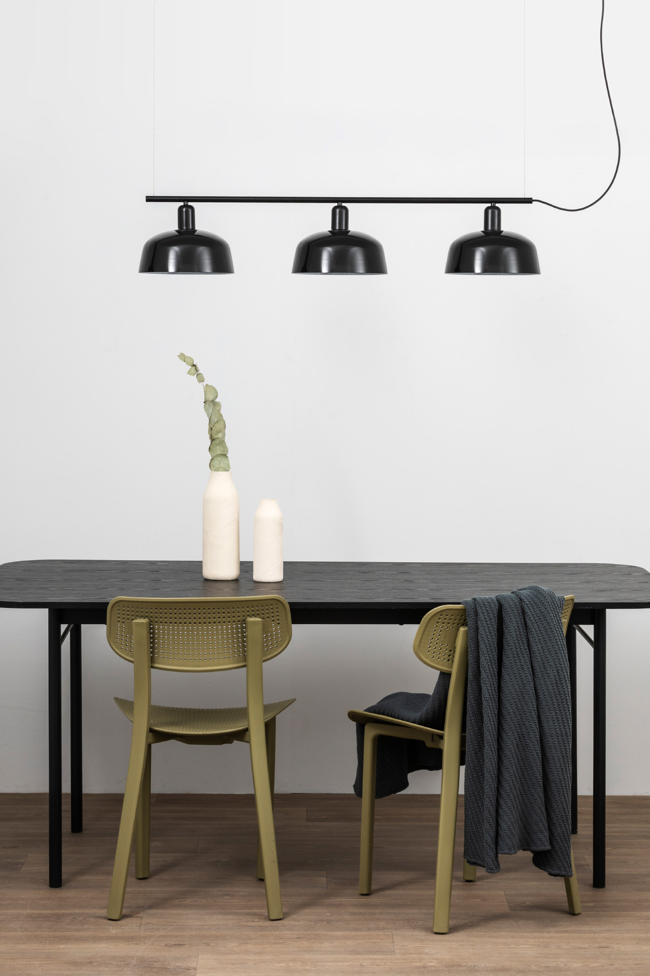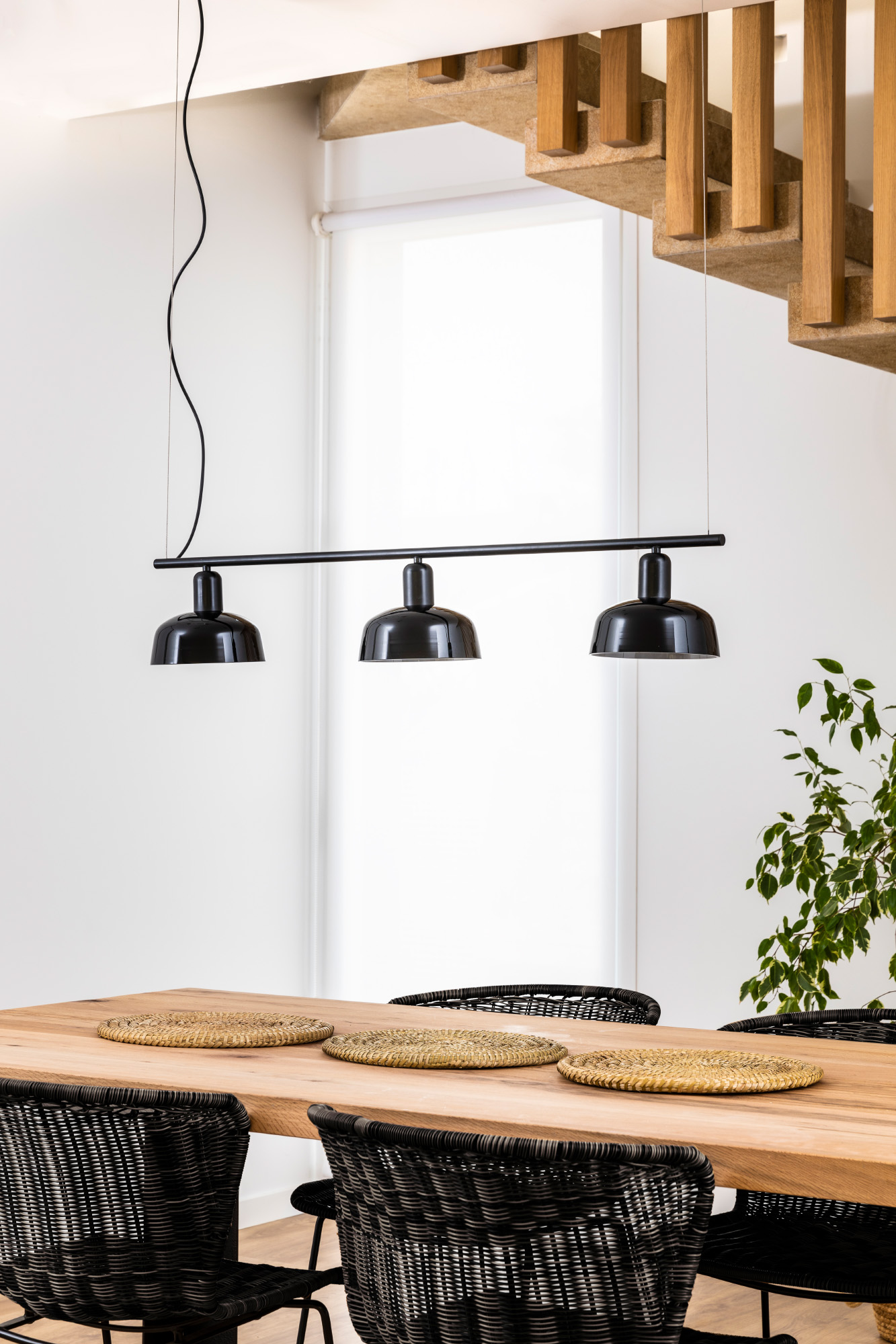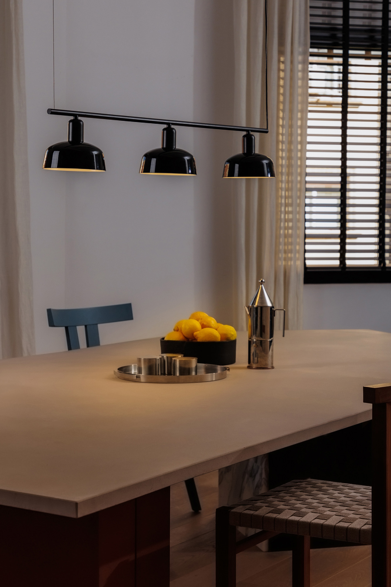TATAWIN LINEAL S — это семейство светильников, разработанное Адольфо Абейоном. Форма тени напоминает верхнюю часть характерных домов Татауина, города на юго-востоке Туниса. Этот черный линейный подвесной светильник имеет абажуры из черного глянцевого стекла.