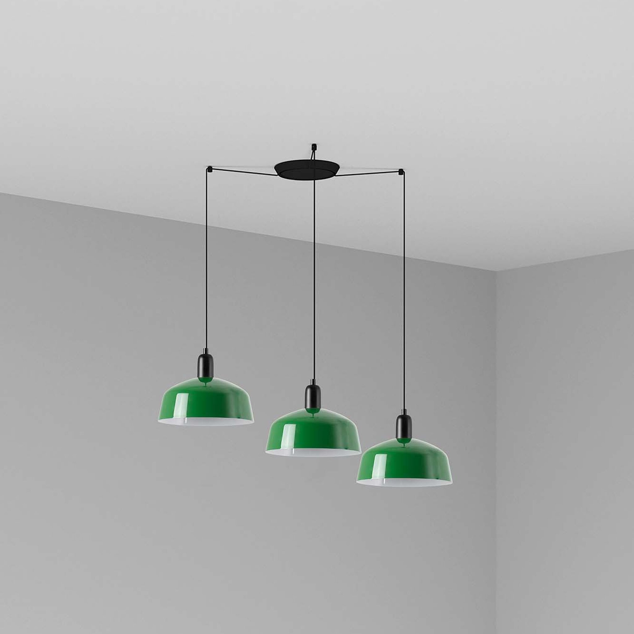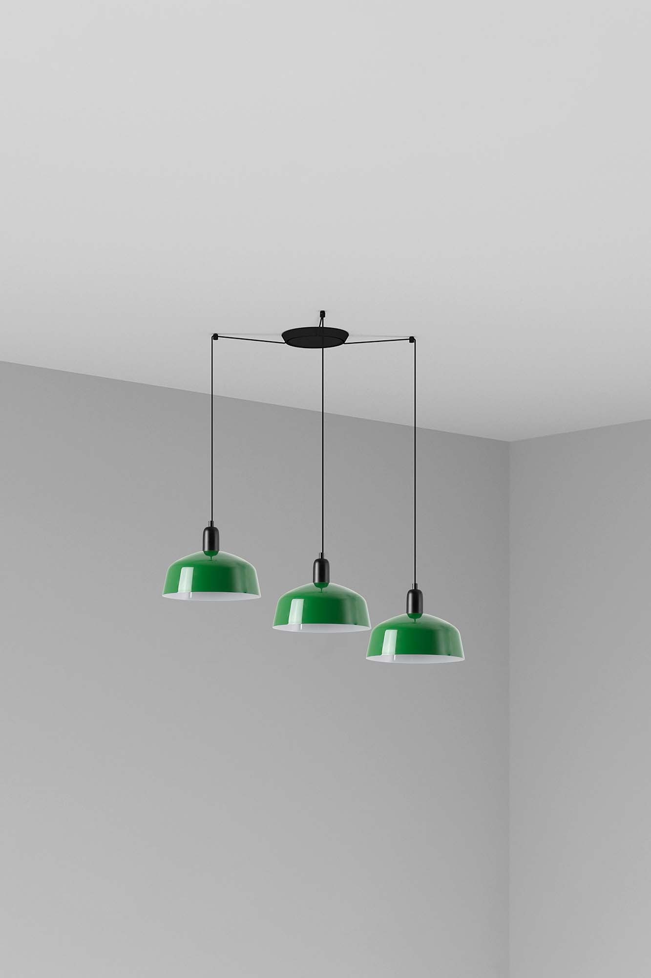 TATAWIN — это серия светильников, разработанная Адольфо Абейоном. Форма абажура напоминает верхнюю часть характерных домов Татауина, города, расположенного на юго-востоке Туниса. Этот подвесной светильник с черной конструкцией состоит из зеленого металлического абажура, который обеспечивает направленный свет.