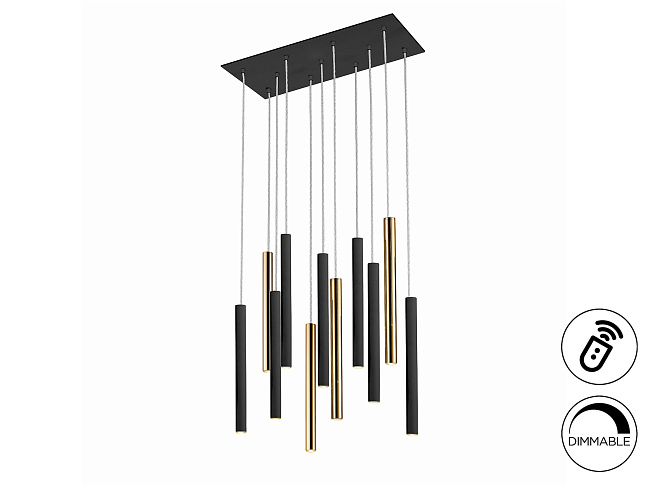 Подвесной светильник LED с 11 лампами из металла с покрытием "блестящее золото" и матовым чёрным покрытием. Акриловый рассеиватель опaлового цвета. 55W LED, 4950 Lm, 3000 K. ДИММИРУЕМЫЙ. Этот продукт включает в себя светодиодный приемник с диммером 0-10 В или ШИМ и радиочастотный пульт дистанционного управления. Для использования с настенным регулятором используйте только диммеры этих двух типов регулирования. Диммер другого типа может повредить драйвер светодиода.Этот продукт включает в себя светодиодный приемник с диммером 0-10 В или ШИМ и радиочастотный пульт дистанционного управления. Для использования с настенным регулятором используйте только диммеры этих двух типов регулирования. Диммер другого типа может повредить драйвер светодиода.