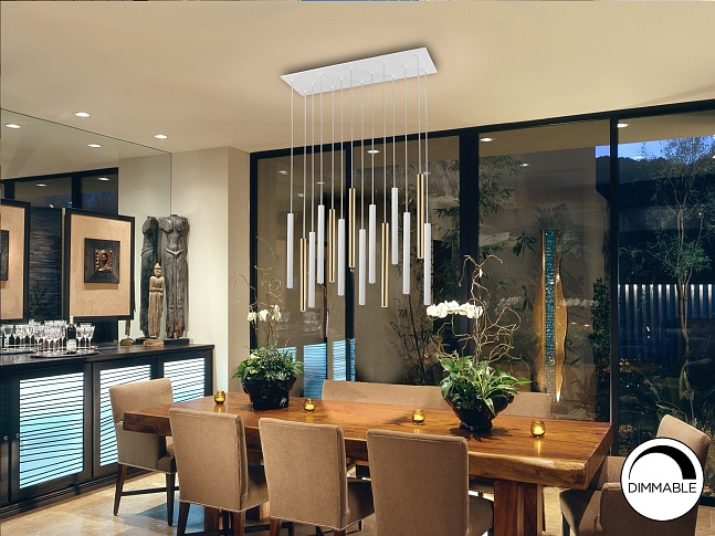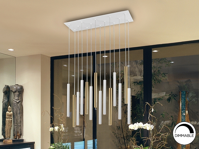 Подвесной светильник LED с 14 лампами из металла с покрытием "блестящее золото" и матовым белым покрытием. Акриловый рассеиватель опaлового цвета. 70W LED, 6300 Lm, 3000 K. Диммируемый.