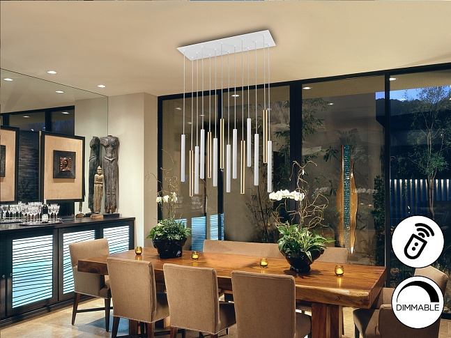 Подвесной светильник LED с 14 лампами из металла с блестящим золотистым и матовым белым покрытием. Акриловый рассеиватель опaлового цвета. 70W LED, 6300 Lm, 3000 K. Диммируемый. Этот продукт включает в себя светодиодный приемник с диммером 0-10 В или ШИМ и радиочастотный пульт дистанционного управления. Для использования с настенным регулятором используйте только диммеры этих двух типов регулирования. Диммер другого типа может повредить драйвер светодиода.