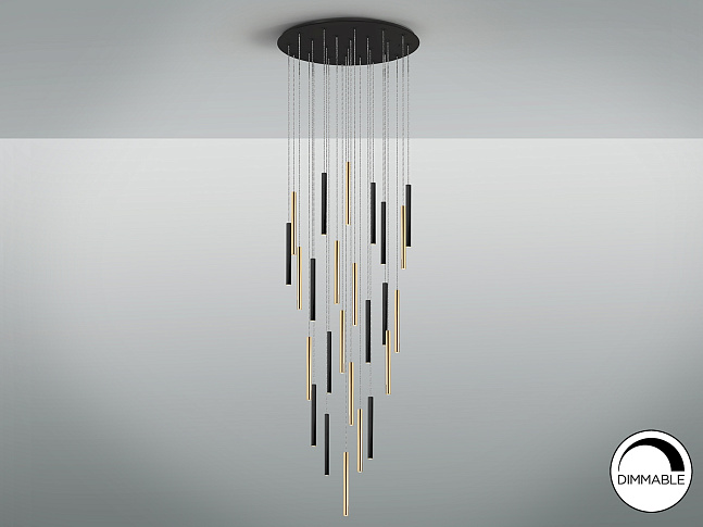 Круглый светодиодный светильник на 25 ламп. Изготовлен из металла, покрыт золотом и черным матовым покрытием. Рассеиватель из опалового акрила. Светодиод 125 Вт, 11250 лм, 3000 К. Максимальная длина 300 см. DIMMABLE.