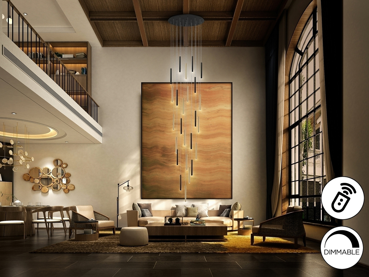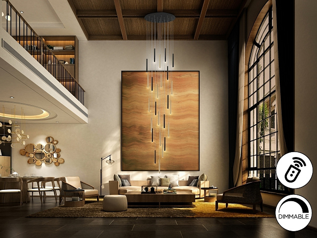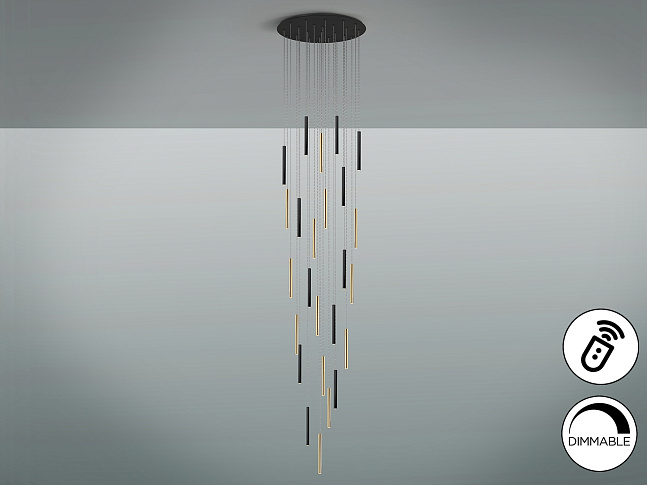 Круглый светодиодный светильник на 25 ламп. Изготовлен из металла, покрыт золотом и черным матовым покрытием. Рассеиватель из опалового акрила. 125 Вт светодиод, 11250 лм, 3000 К. Максимальная длина 500 см. DIMMABLE. Пульт дистанционного управления в комплекте. Этот продукт включает в себя диммерный приемник и пульт дистанционного управления по радиочастоте.