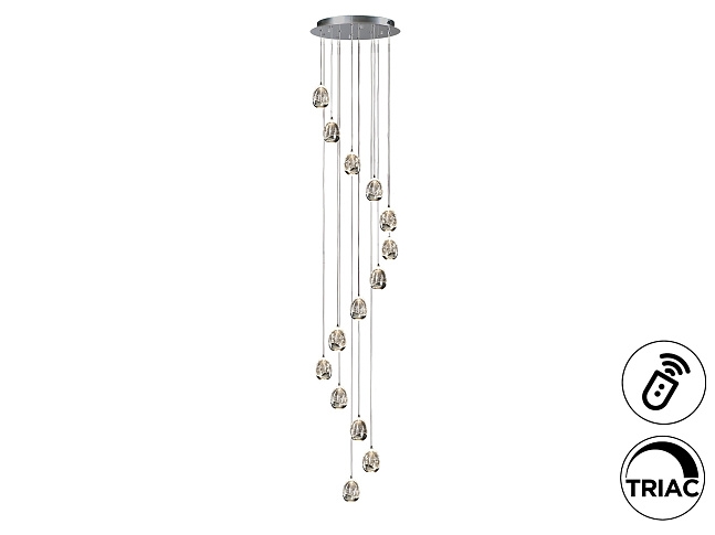 Светодиодная лампа 14 л. из металла, хромированная отделка. Стеклянные плафоны каплевидной формы из цельного стекла с декоративными пузырьками внутри. Регулируется по длине. Макс..высота 5 метров. Светодиод мощностью 70 Вт. 6.720 лм. 3.000К. ДИММИРУЕМАЯ. Драйвер TRIAC и НАБОР DIMMING SET включены. Этот продукт включает в себя светодиодные драйверы с триаком и регулировкой яркости 0–10 В. В комплект входит комплект затемнения с приемником и радиочастотным пультом дистанционного управления. Его также можно использовать с симисторным или настенным диммером 0–10 В. · Эта лампа поставляется с ГРАВИТАЦИОННЫМИ ПЕРЕКЛЮЧАТЕЛЯМИ для улучшения крепления к потолку.
