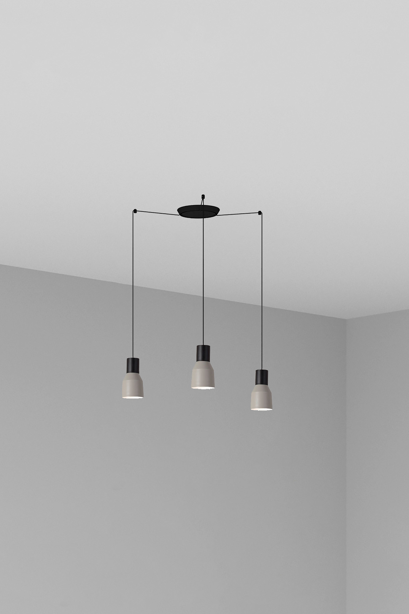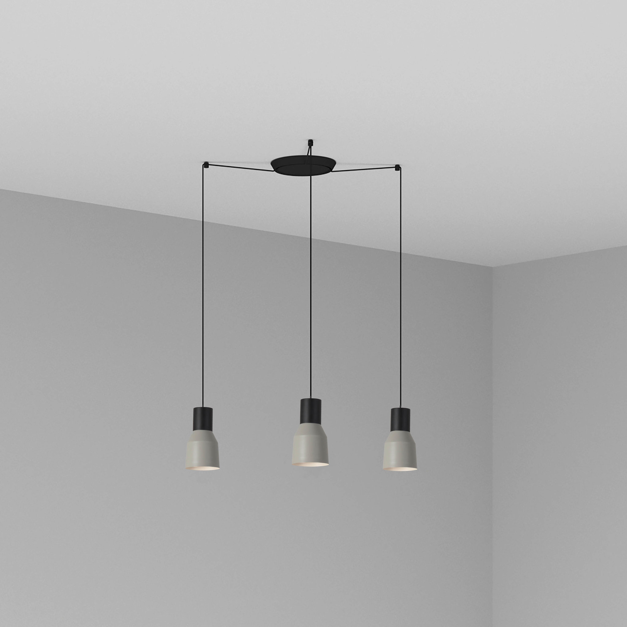 KOMBO — это семейство подвесных светильников, созданное Nutcreatives. Серия имеет разные размеры и отделку, которые имеют черную цилиндрическую структуру в верхней части. Абажур этого серого света выполнен из металла, выполнен в стиле минимализма и играет с геометрическими формами. Версия с 3 лампами.