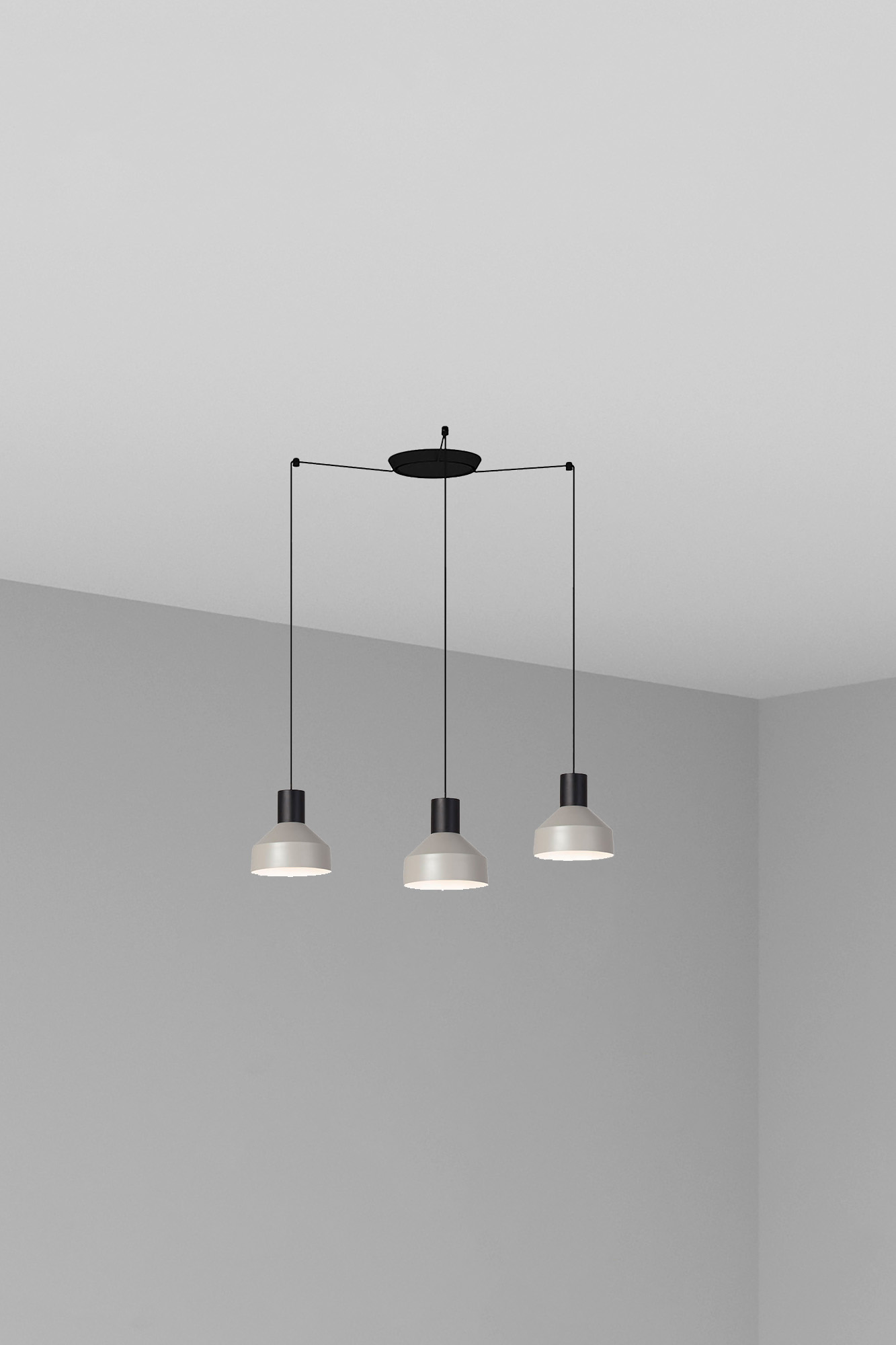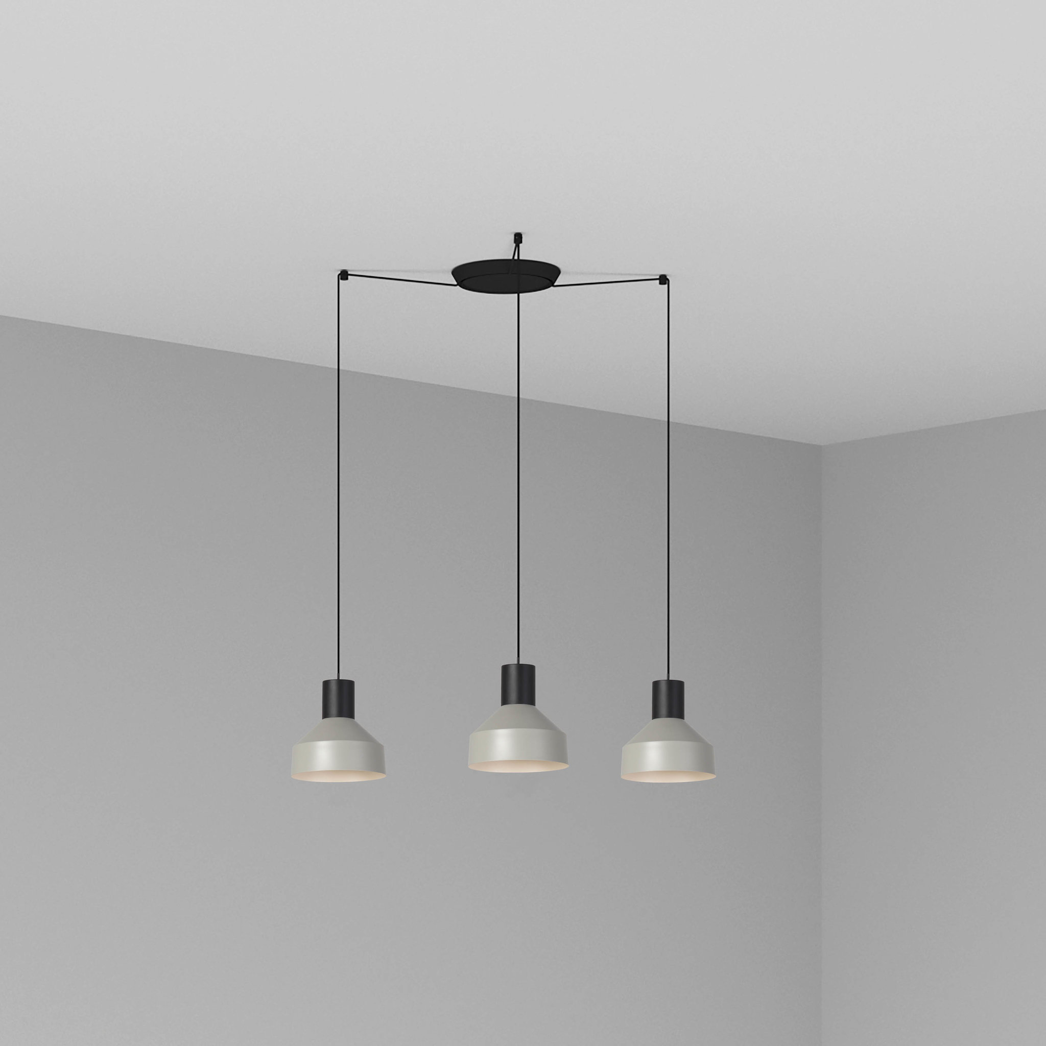 KOMBO — это семейство подвесных светильников, созданное Nutcreatives. Серия имеет разные размеры и отделку, которые имеют черную цилиндрическую структуру в верхней части. Абажур этого серого света выполнен из металла, выполнен в стиле минимализма и играет с геометрическими формами. Версия с 3 лампами. Его диаметр составляет 20 см.