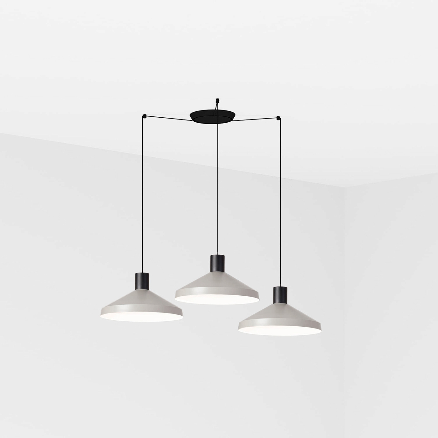 KOMBO — это семейство подвесных светильников, созданное Nutcreatives. Серия имеет разные размеры и отделку, которые имеют черную цилиндрическую структуру в верхней части. Абажур этого серого света выполнен из металла, выполнен в стиле минимализма и играет с геометрическими формами. Версия с 3 лампами. Его диаметр составляет 40 см.
