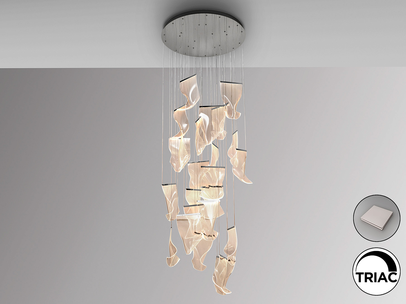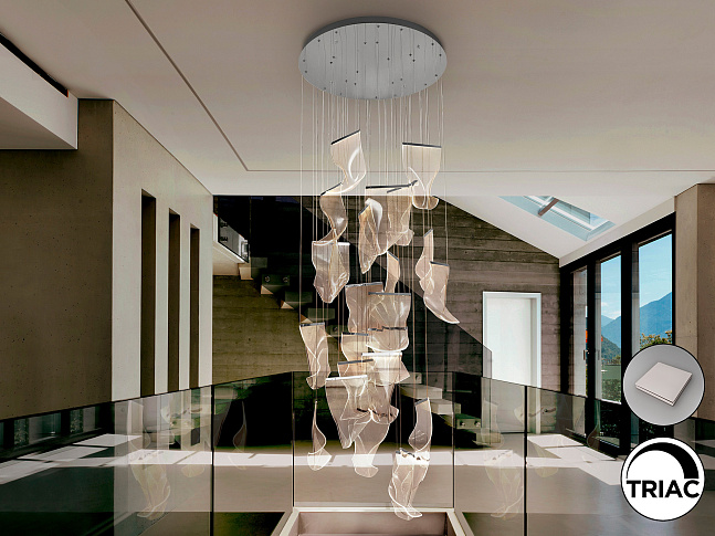 Лампа БОЛЬШОГО ФОРМАТА из хромированного металла и оттенков формованного микропечатного метакрилата. Светодиодное освещение. С регулируемой яркостью, 120 Вт, 7200 лм, 3000 К. Включает в себя драйвер TRIAC и набор для регулировки яркости В этом изделии используется светодиодный драйвер с симистором и регулировкой яркости от 0 до 10 В, в комплект входит диммер с регулятором яркости и радиочастотным пультом дистанционного управления, а также диммер с симистором или настенный диммер с регулировкой яркости от 0 до 10 В. · В комплект поставки лампы входят ГРАВИТАЦИОННЫЕ КНОПКИ для более удобной установки на потолке.