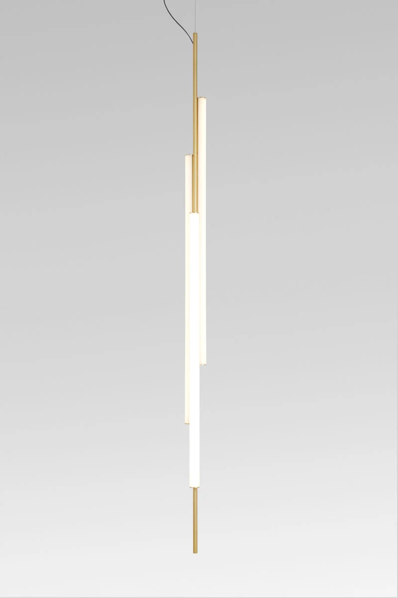 Ambrosia V3, объединяет три световые трубки, расположенные на разной высоте, образуя скульптурный ансамбль. Эта опция может обеспечить большое количество света и, следовательно, поставляется с системой затемнения для удобства управления освещением. Он доступен в двух вариантах высоты - 130 и 175 см. Оба размера могут быть электрически подключены через потолочную розетку или напольную вилку. Новая система Ambrosia позволяет создавать вертикальные световые композиции, комбинируя различные размеры для освещения больших пространств. При индивидуальной установке она наполняет пространство светом и теплом. Ее изящный дизайн создает идеальную обстановку в любом помещении. Совершенно новый взгляд на эту гибкую систему освещения, которая обеспечивает максимальную световую выразительность благодаря минималистичной конструкции. Металлическая конструкция доступна в двух вариантах отделки – черном и матово–золотом, а источник света - в трех цветовых температурах: 2200 К, 2700 К и 3000 К.