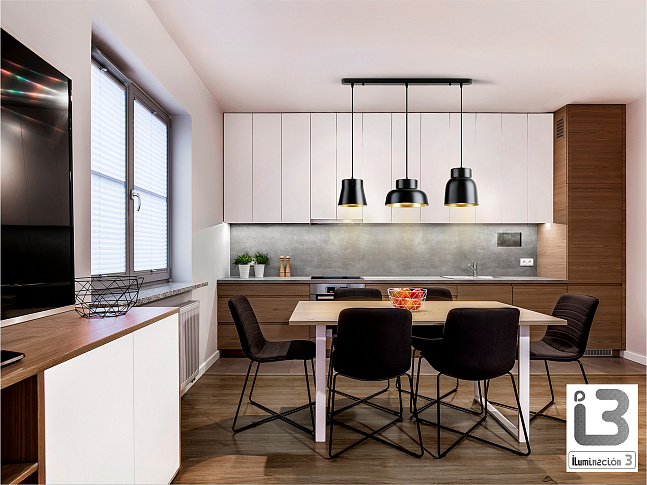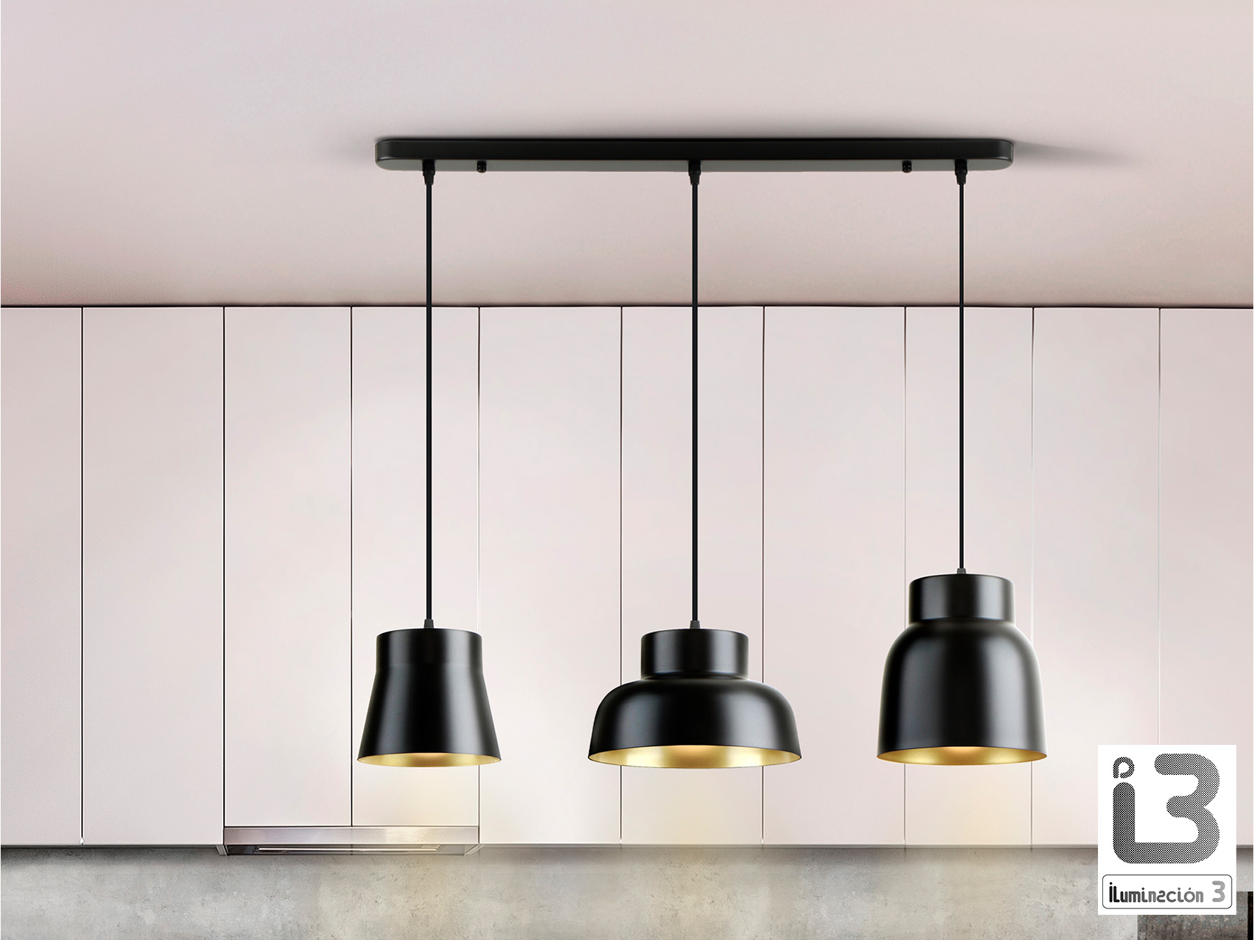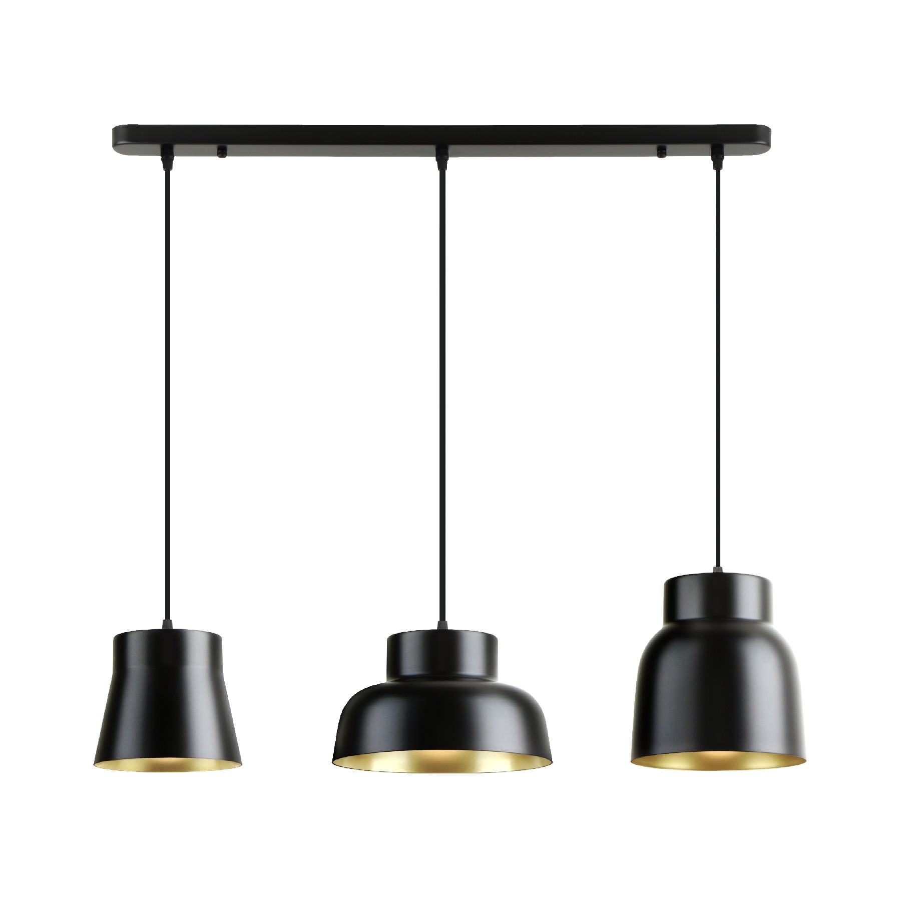 Лампа с 3 плафонами из металла, окрашенного в матовый чёрный и золотистый цвета. Регулируется по высоте. 3 патрона E27