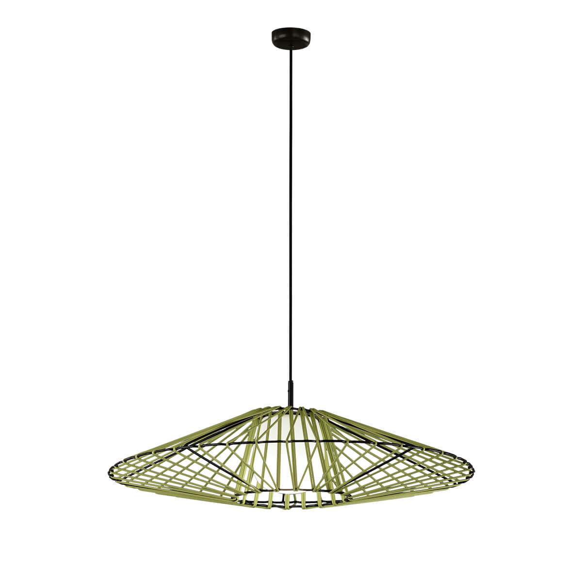 Подвесной светильник с абажуром диаметром 80 см из плетеного вручную шнура из переработанных пластиковых бутылок на черной металлической конструкции. Выберите один или два стандартных цвета шнуров для комбинирования. IP66 для использования на открытом воздухе.