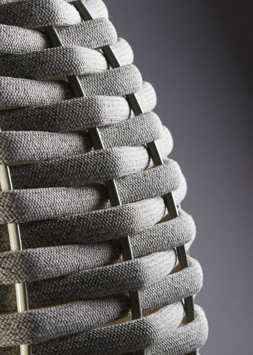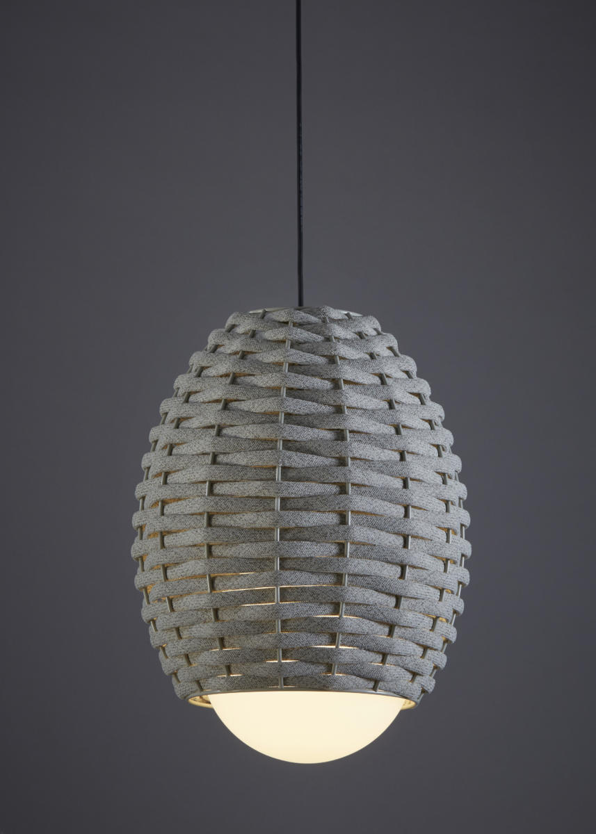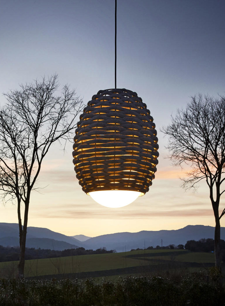 Подвесной светильник для внутреннего и наружного применения с металлическим каркасом, обработанным нанофорезом и окрашенным серой краской (RAL7032). Плетеный абажур из текстильного материала с мраморной отделкой и УФ-обработкой. Крепление к потолку с помощью троса и черного неопренового троса. В комплект входит светодиодная лампа. Он отличается своей органической формой и теплотой светового пятна на своих экранах. Все они имеют форму эллиптического шара, оплетенного неопреном, покрытым решетчатой тканью. Эта коллекция для внутреннего и наружного применения дополнена напольным светильником,напольным светильником двух размеров и столешницей.