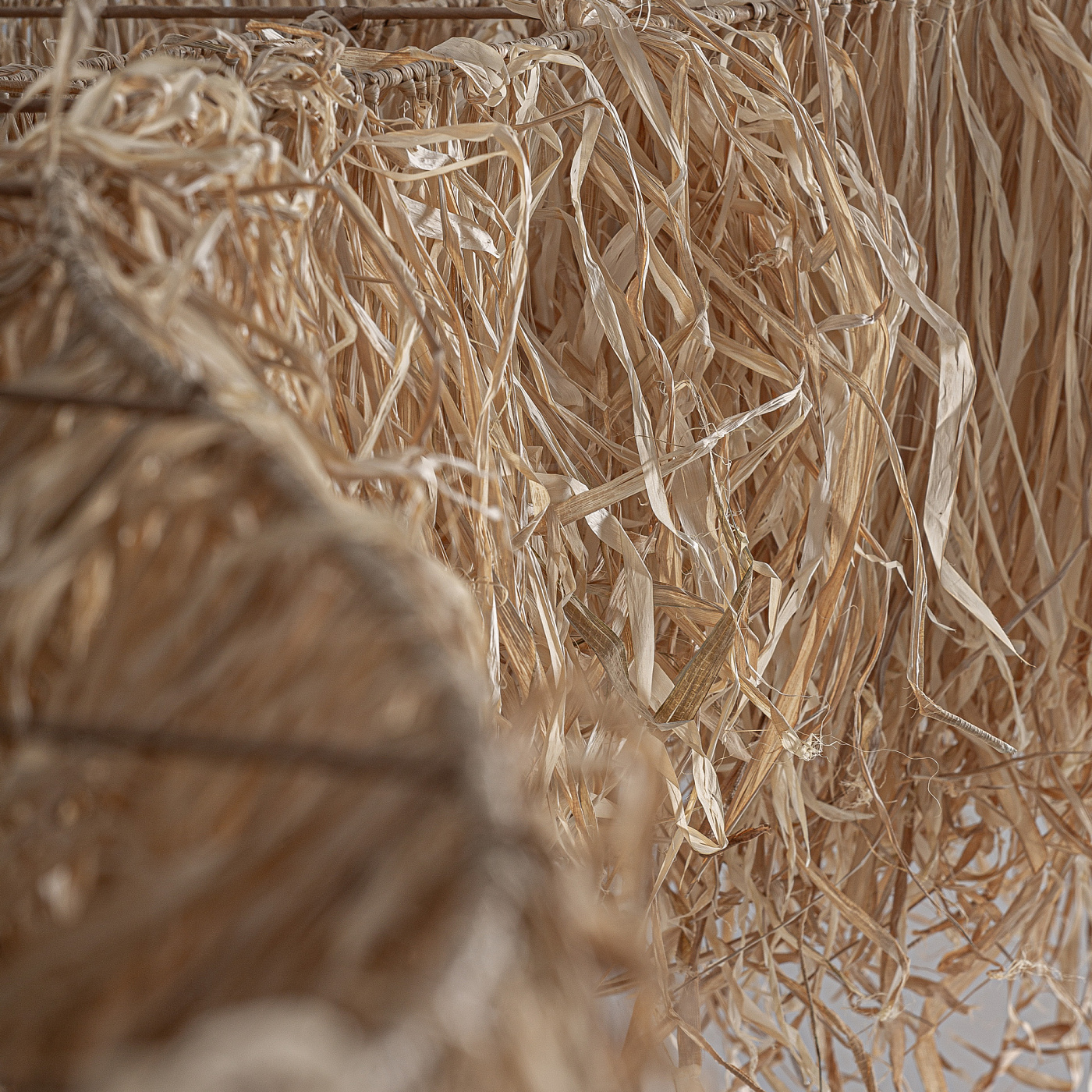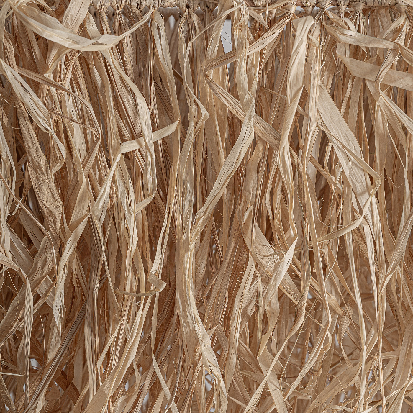 Декоративная потолочная панель в стиле бохо, изготовленная из рафии коричневого цвета. Ширина: 355 см, Глубина: 50 см, Высота: 60 см