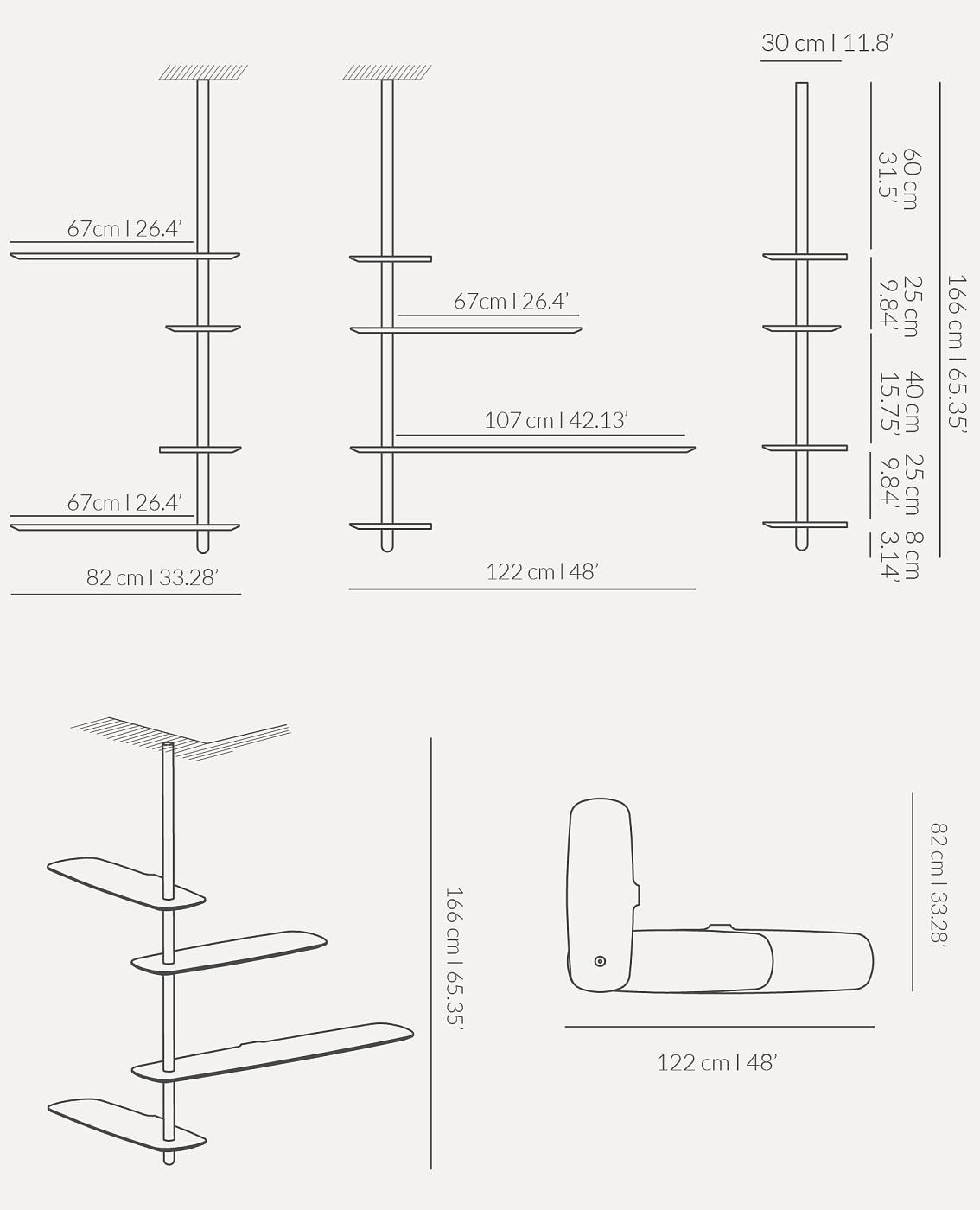 Модульная система, состоящая из полок и секций разной длины. Гарнитур поддерживается центральной осью, на которой попеременно установлены полки, прикрепленные к стене, и свободные полки, что придает конструкции жесткость и динамичность.