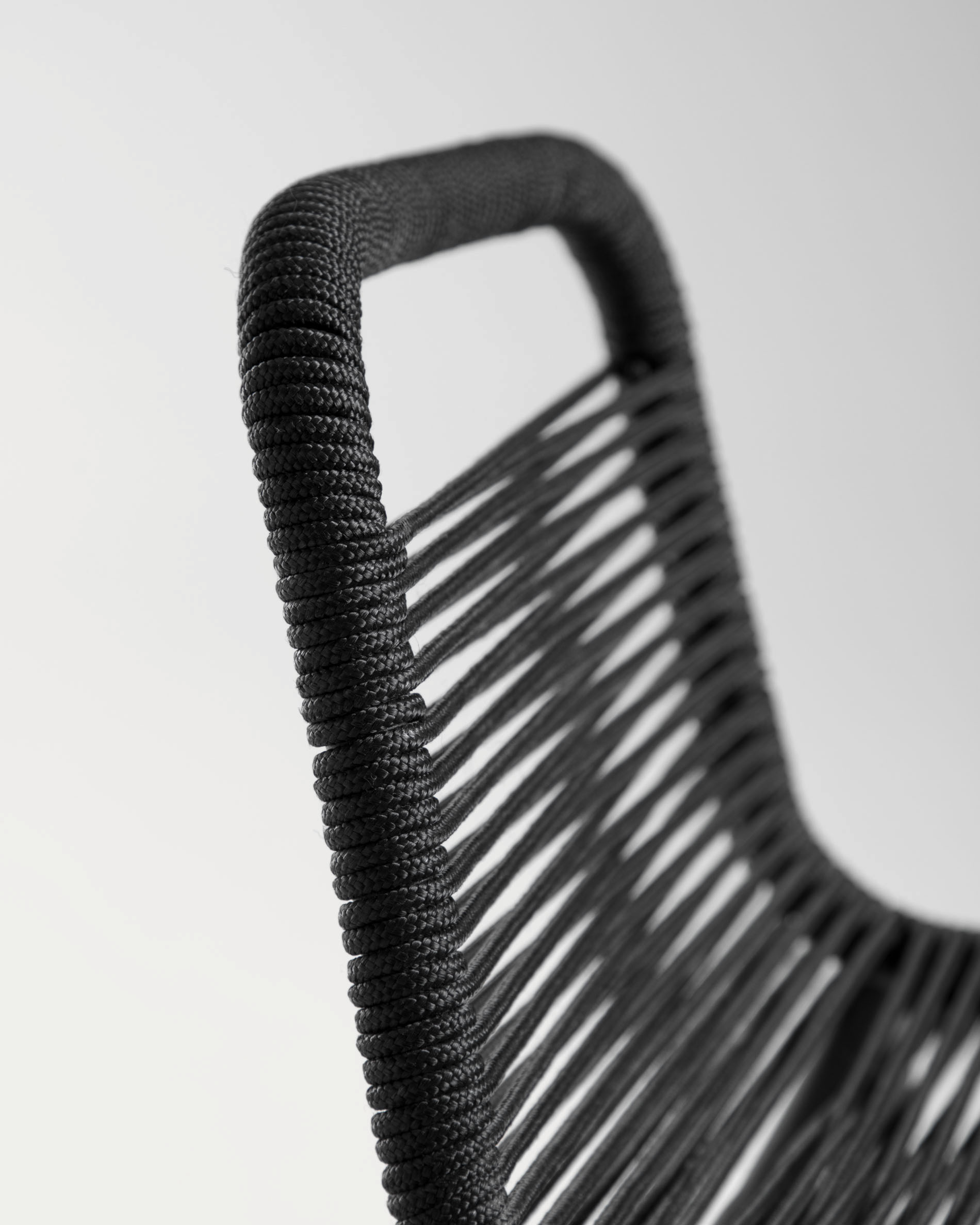 Стул состоит из металлического каркаса и плетеного сиденья из прочного полимерного шнура (95% полипропилен, 5% полиэстер). Сверху есть специальное покрытие, которое защищает нити от вредного воздействия ультрафиолета. Цвет плетения на ваш выбор — бежевый или черный.