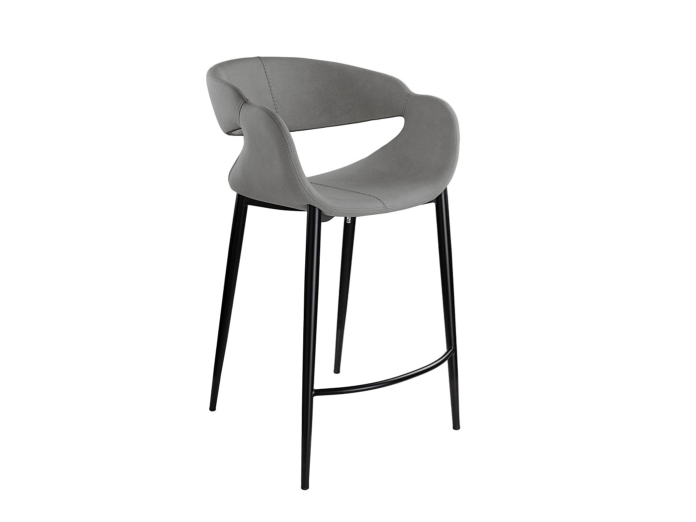 Высокий табурет. Обивка из 100% полиэстера светло-серого цвета с декоративной строчкой. Химчистка. Металлические ножки и подставка для ног с матово-чёрным покрытием. Сиденье и спинка из фанеры и поролона.
