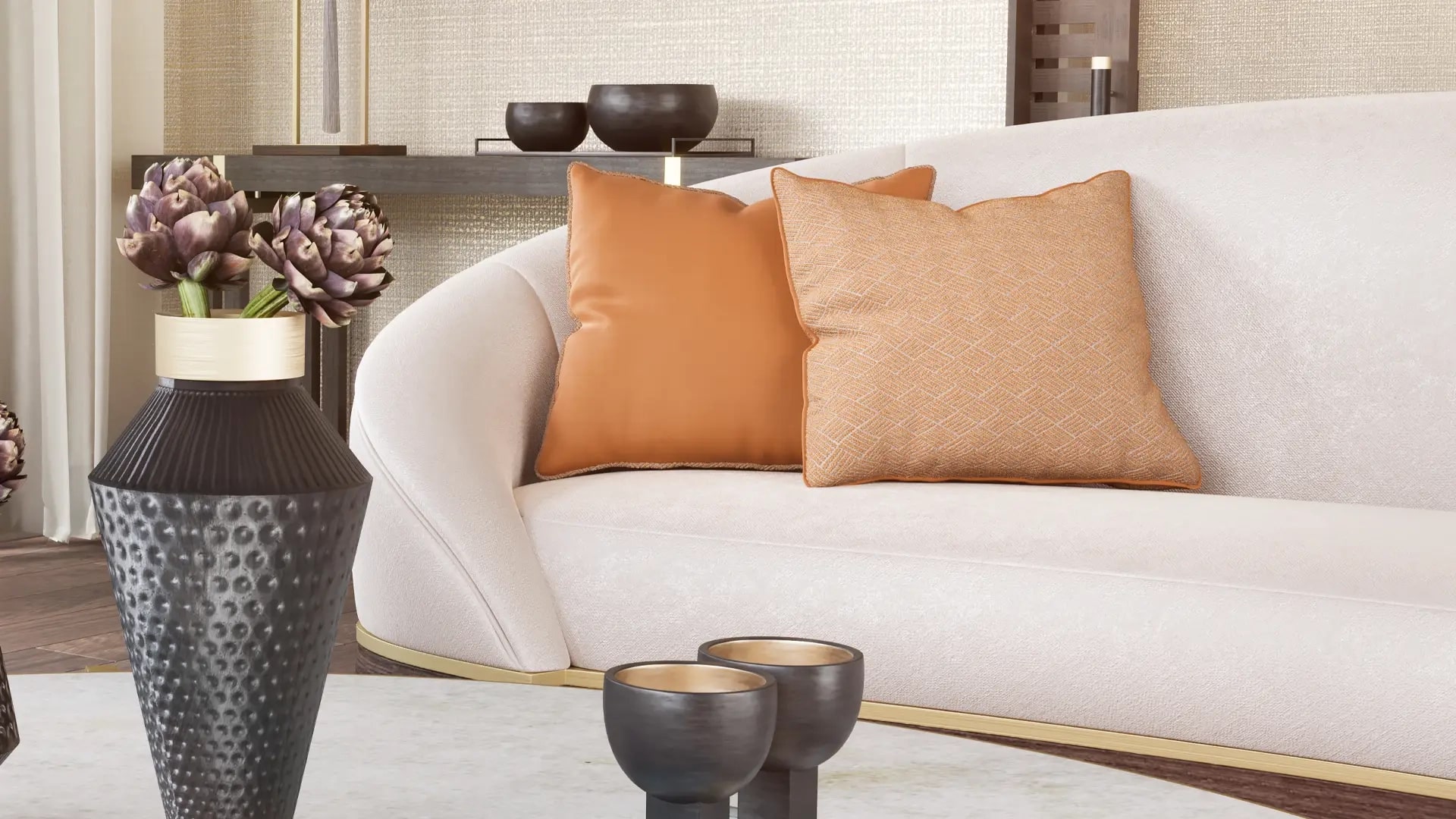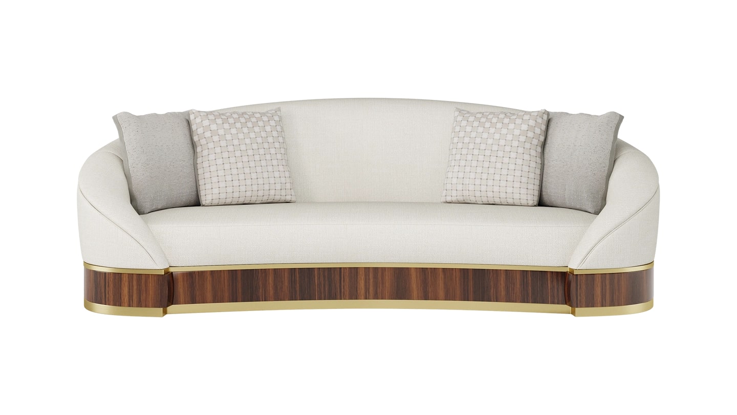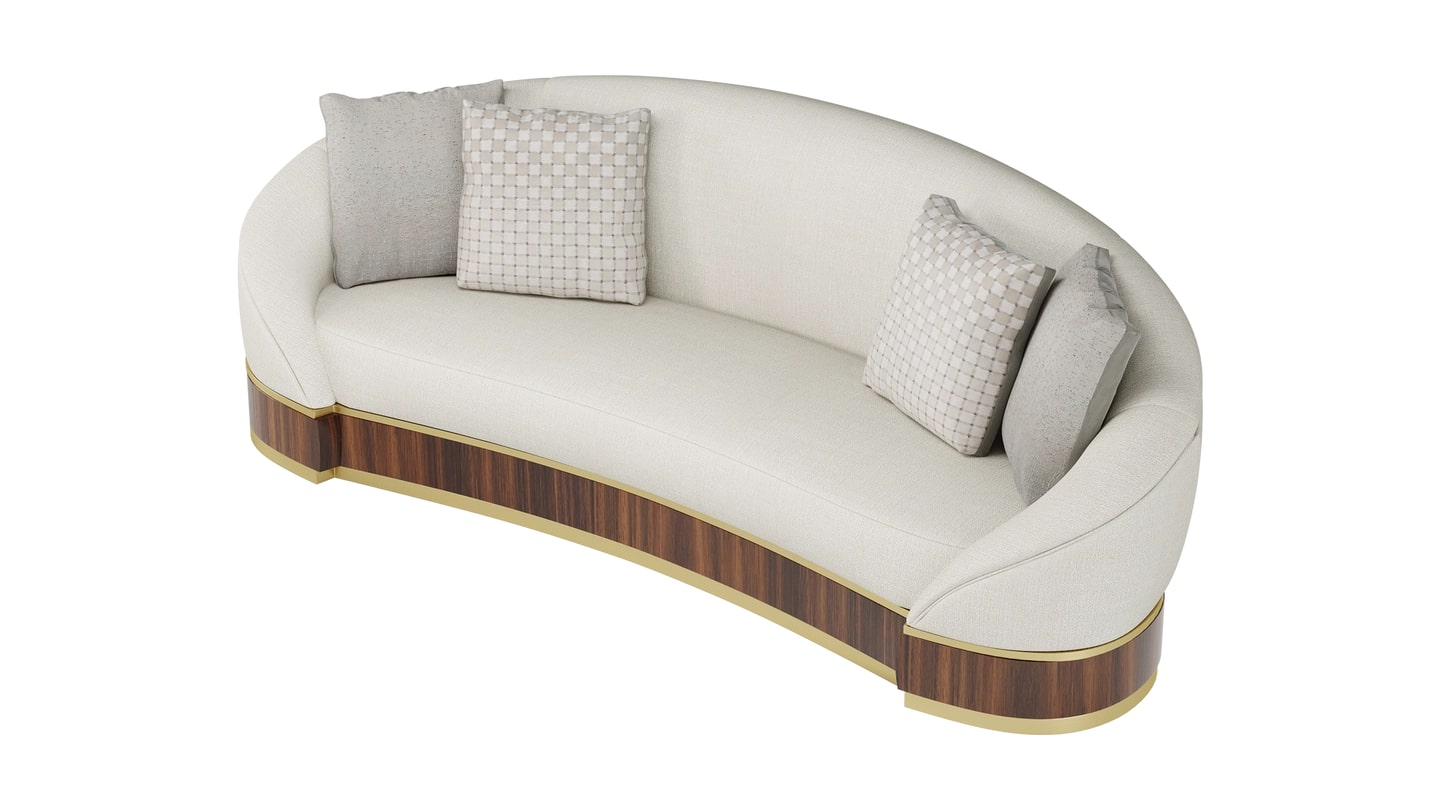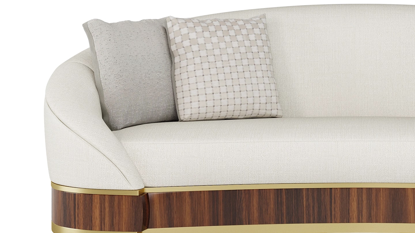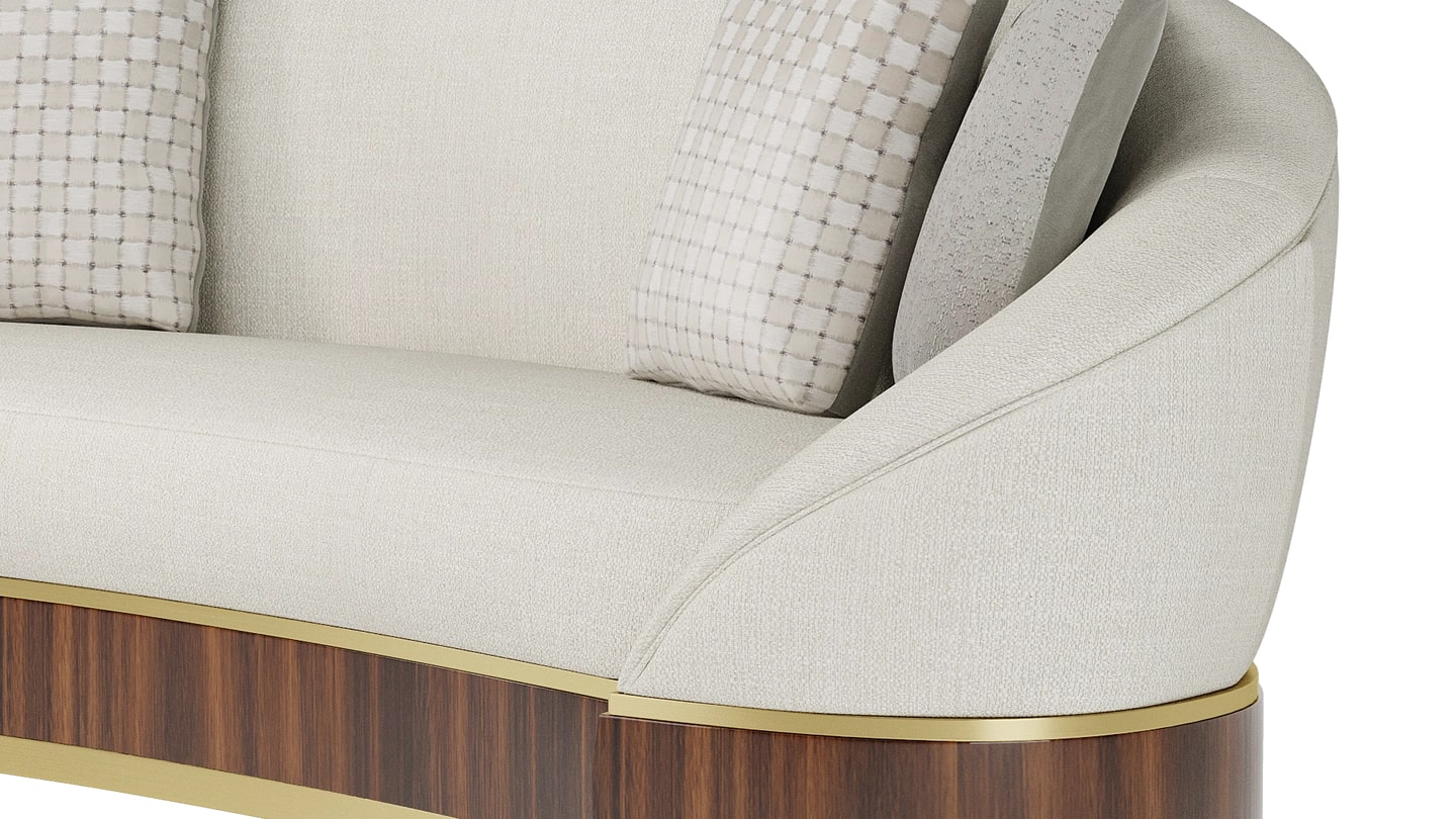 "Наш диван LORETO спроектирован таким образом, чтобы создавать максимальное впечатление в гостиной. Изогнутая форма приглашает вас прижаться друг к другу, в то время как отделка из ореха и матовой латуни придает изделию винтажный вид. "