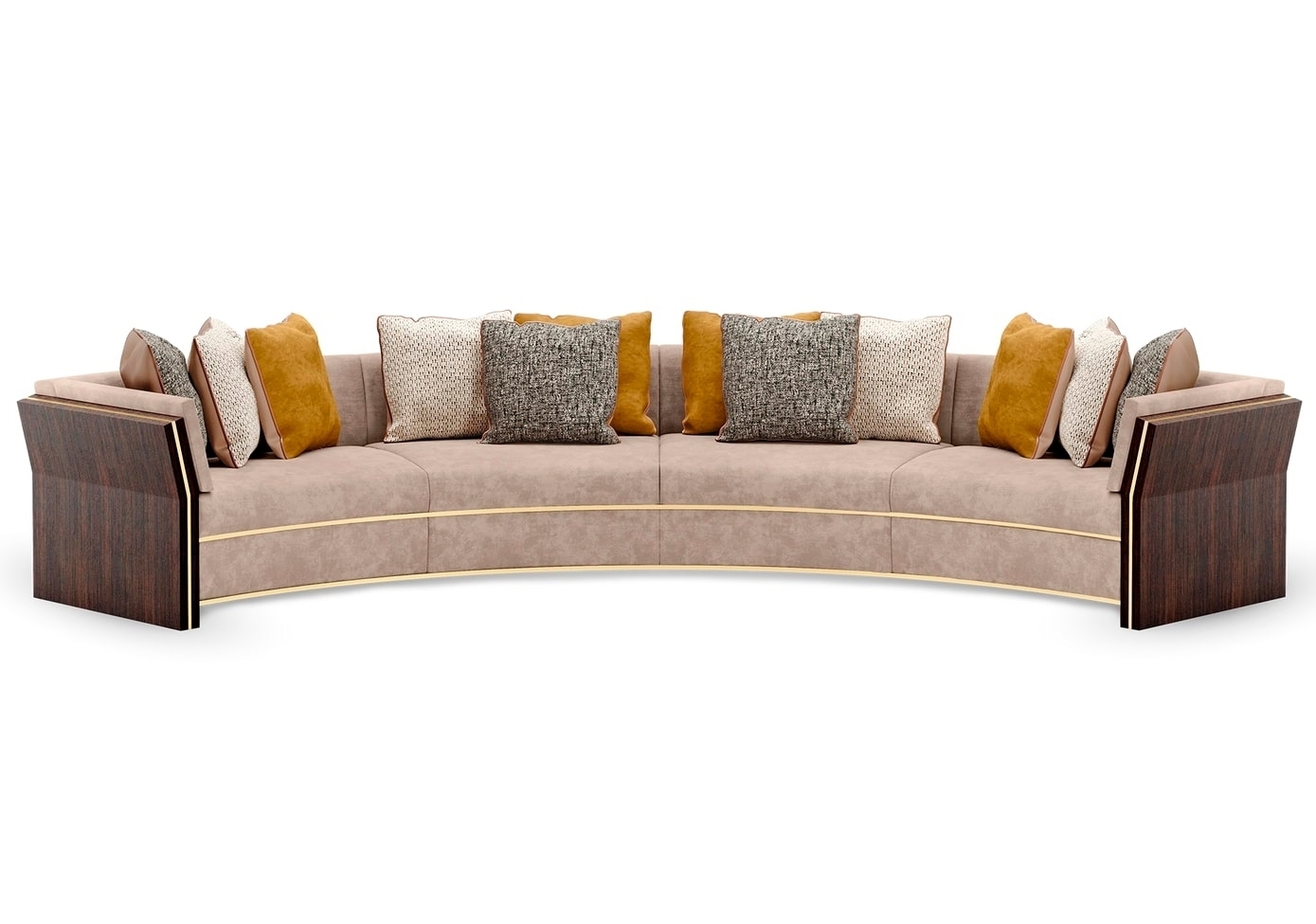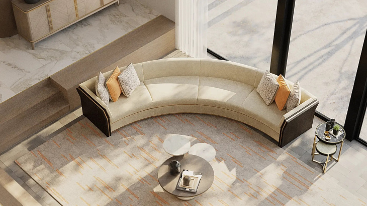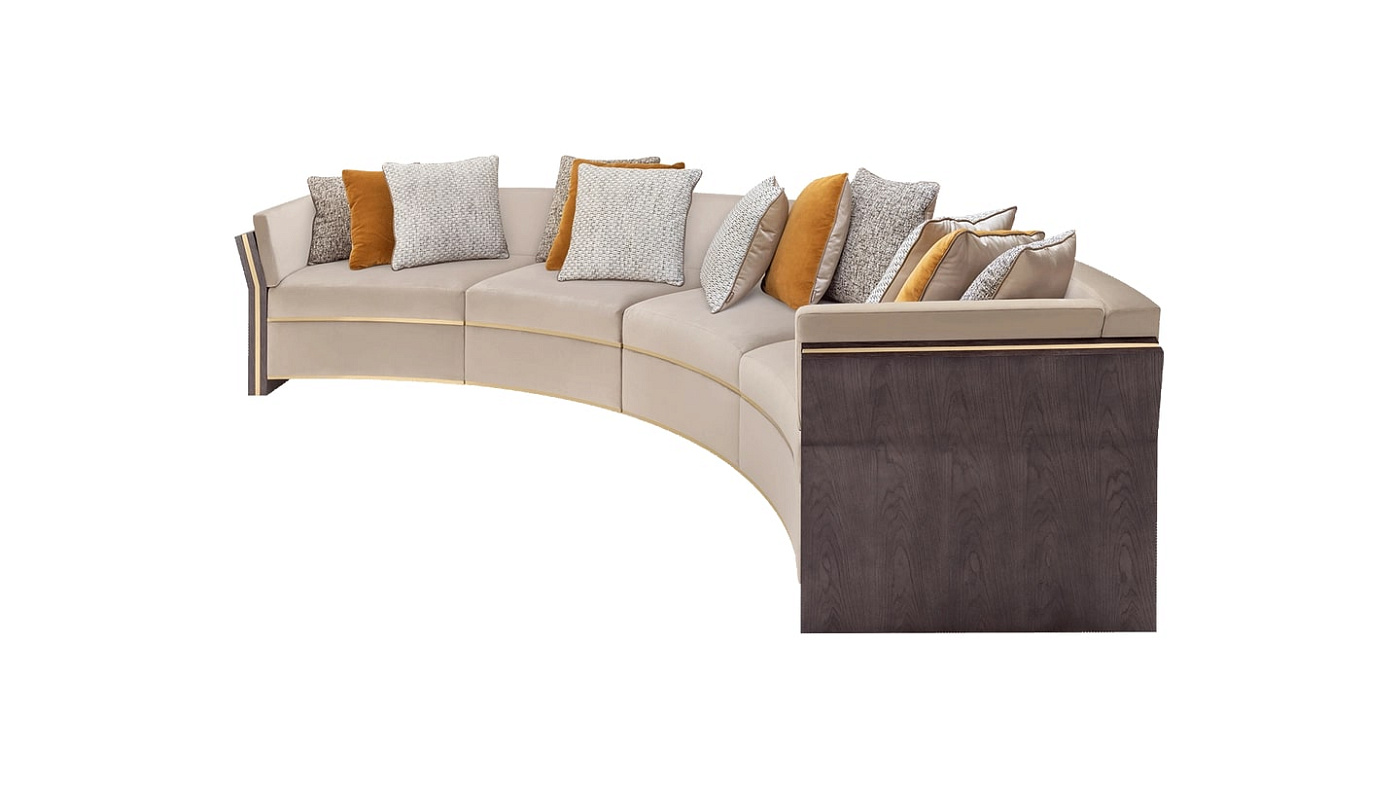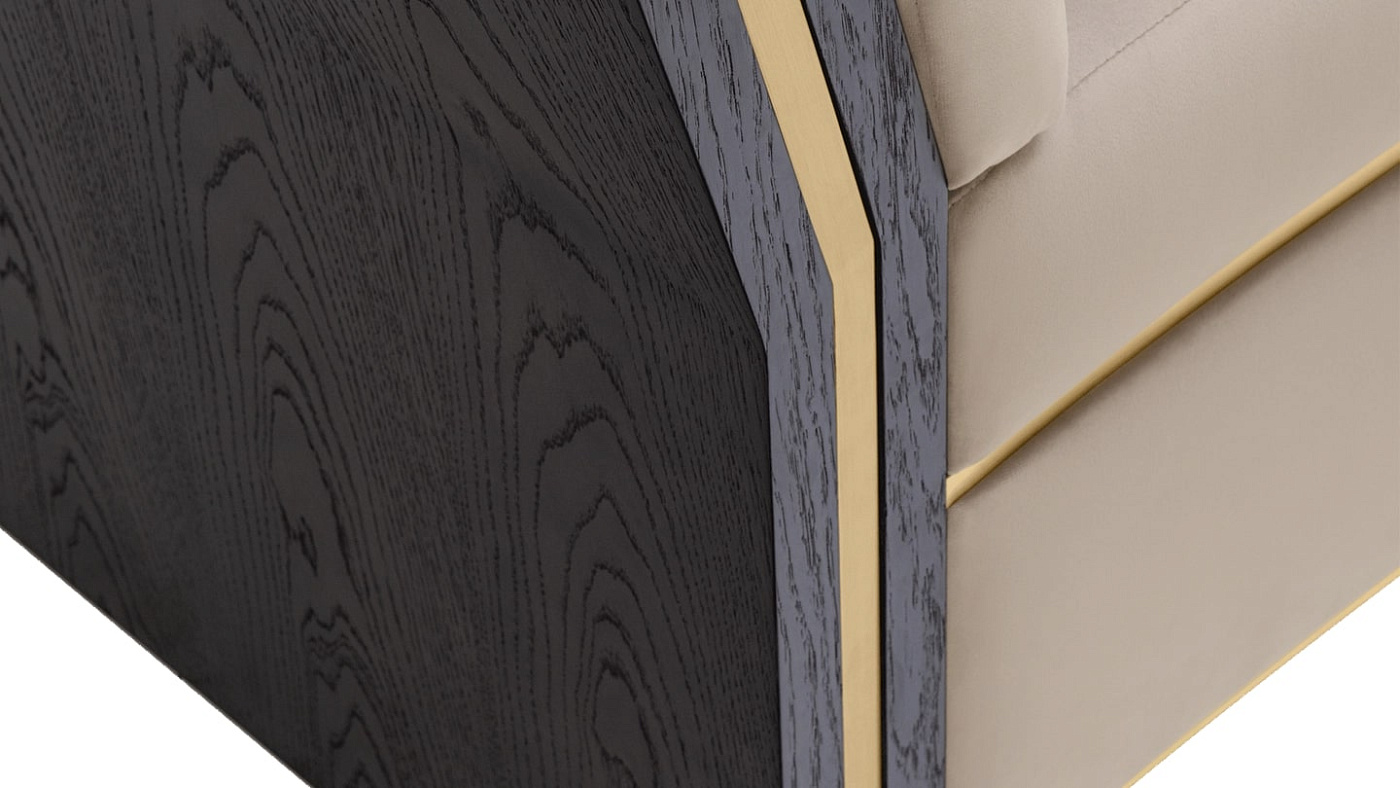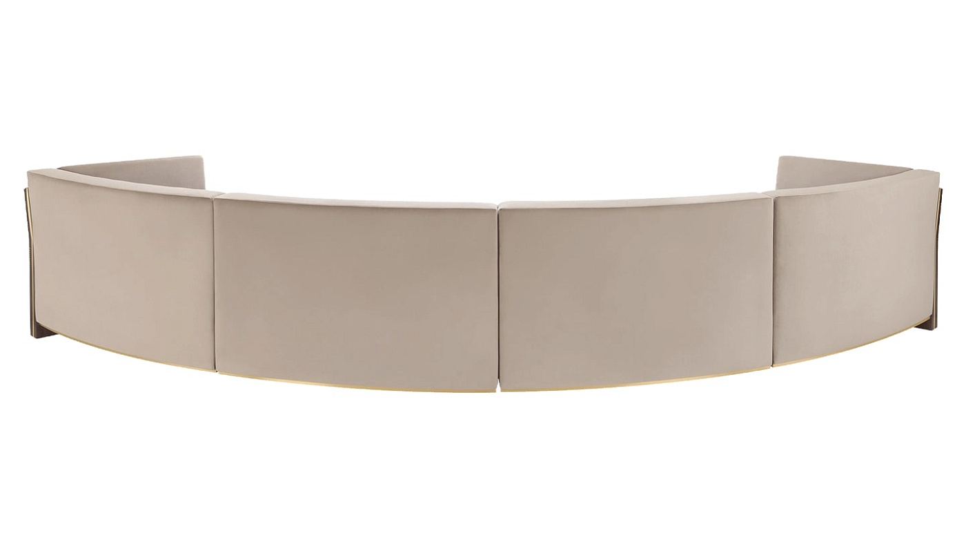 Изогнутый диван UDAIPUR, являющийся отличным решением для сидения, сохраняет обтекаемый вид благодаря своему непринужденному силуэту и линейным вставкам из матовой латуни. Легко парящий над землей дизайн поддерживается конструкциями из деревянного шпона с обоих концов.