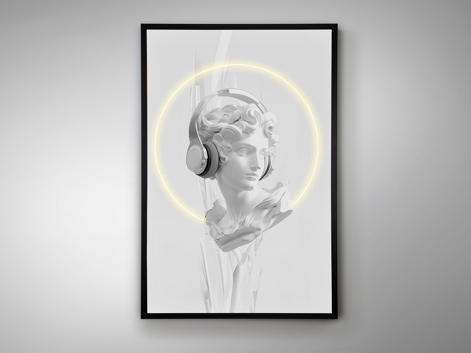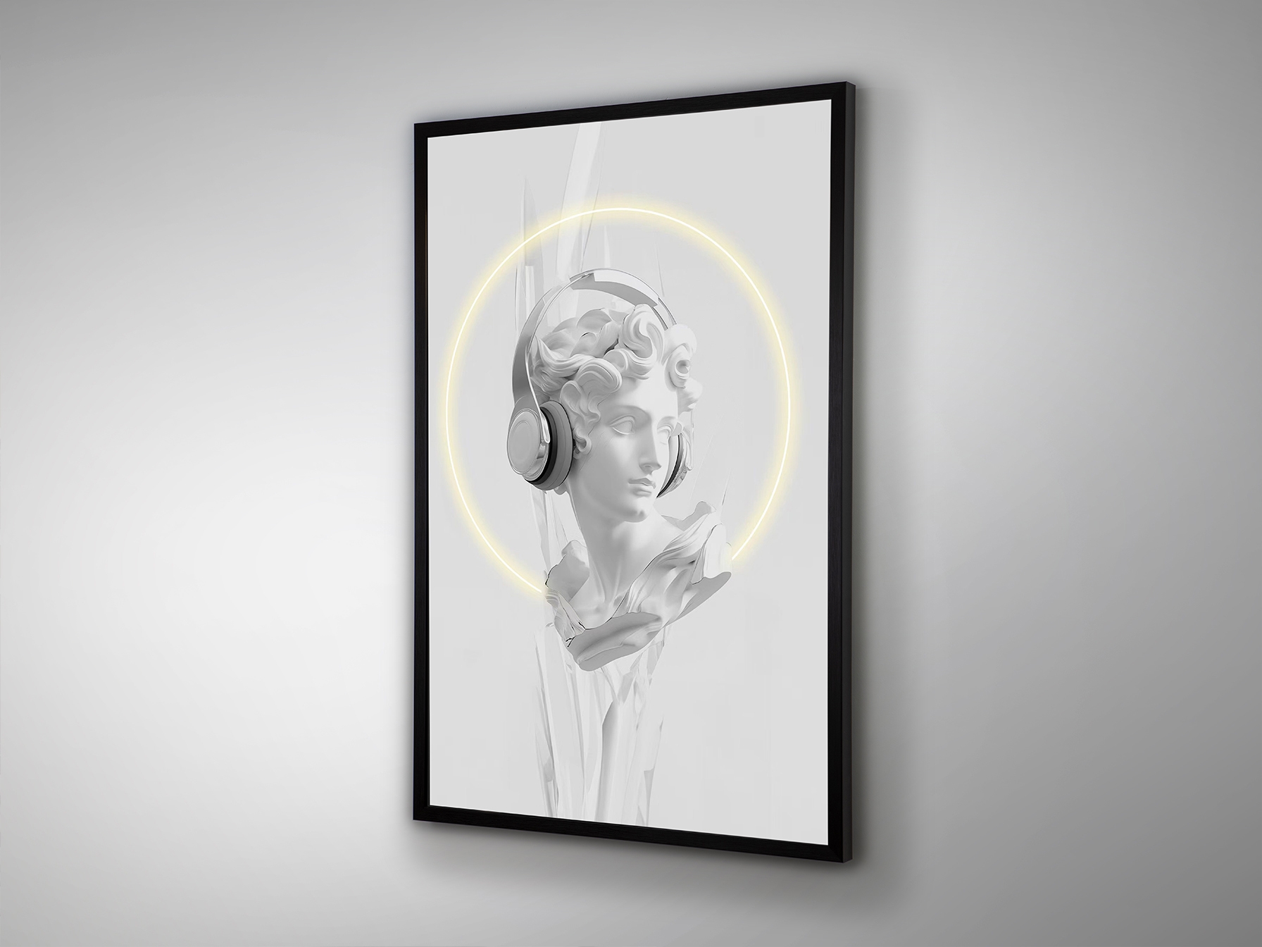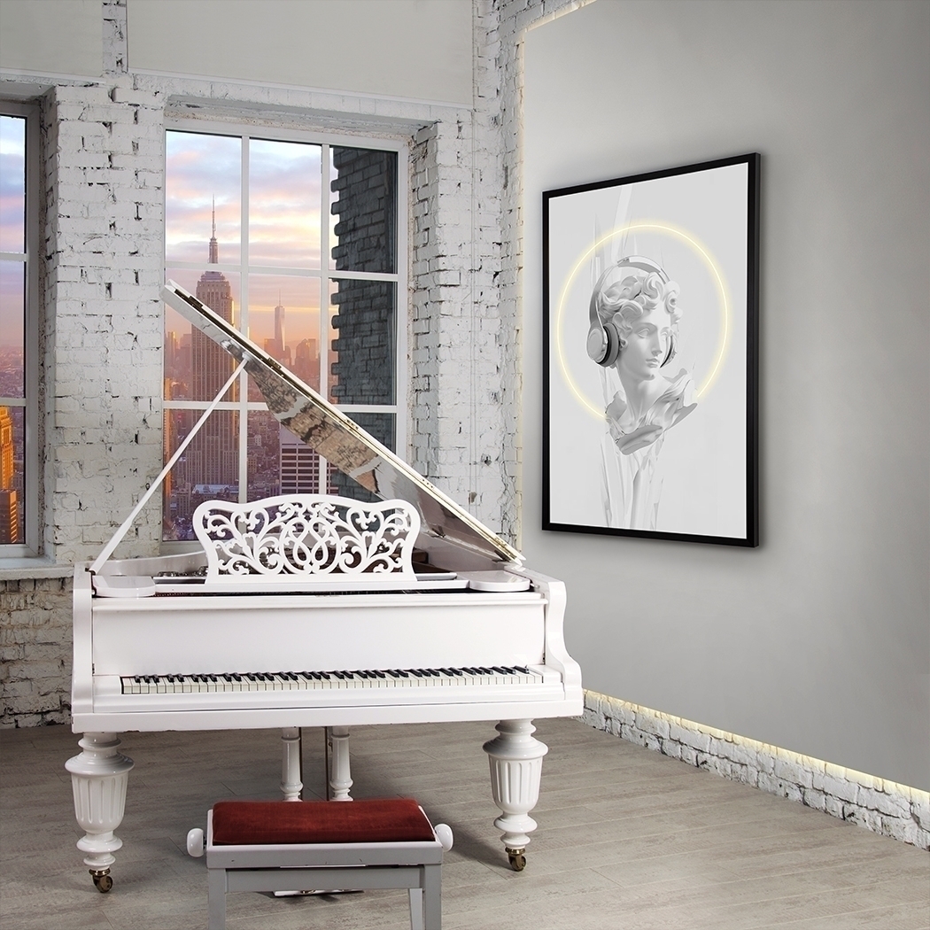 Белый классический бюст с наушниками, композиция с декоративной светодиодной полосой. Печатный холст, наклеенный на доску и оформленный в черную раму. Соединительная коробка на задней стороне полотна. Вилка в комплект не входит.