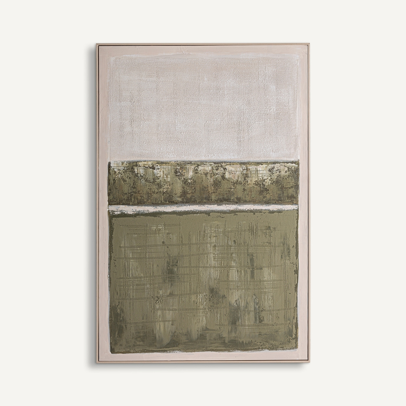 Картина Кайна, созданная VICAL, интерпретирует современный пейзаж через спокойную и сбалансированную палитру. Оттенки зеленого и коричневого, нанесенные вручную, гармонируют со светло-коричневой сосновой рамой, создавая произведение, которое привносит спокойствие, текстуру и визуальную глубину. Ширина: 100 см, Глубина: 4 см, Высота: 150 см