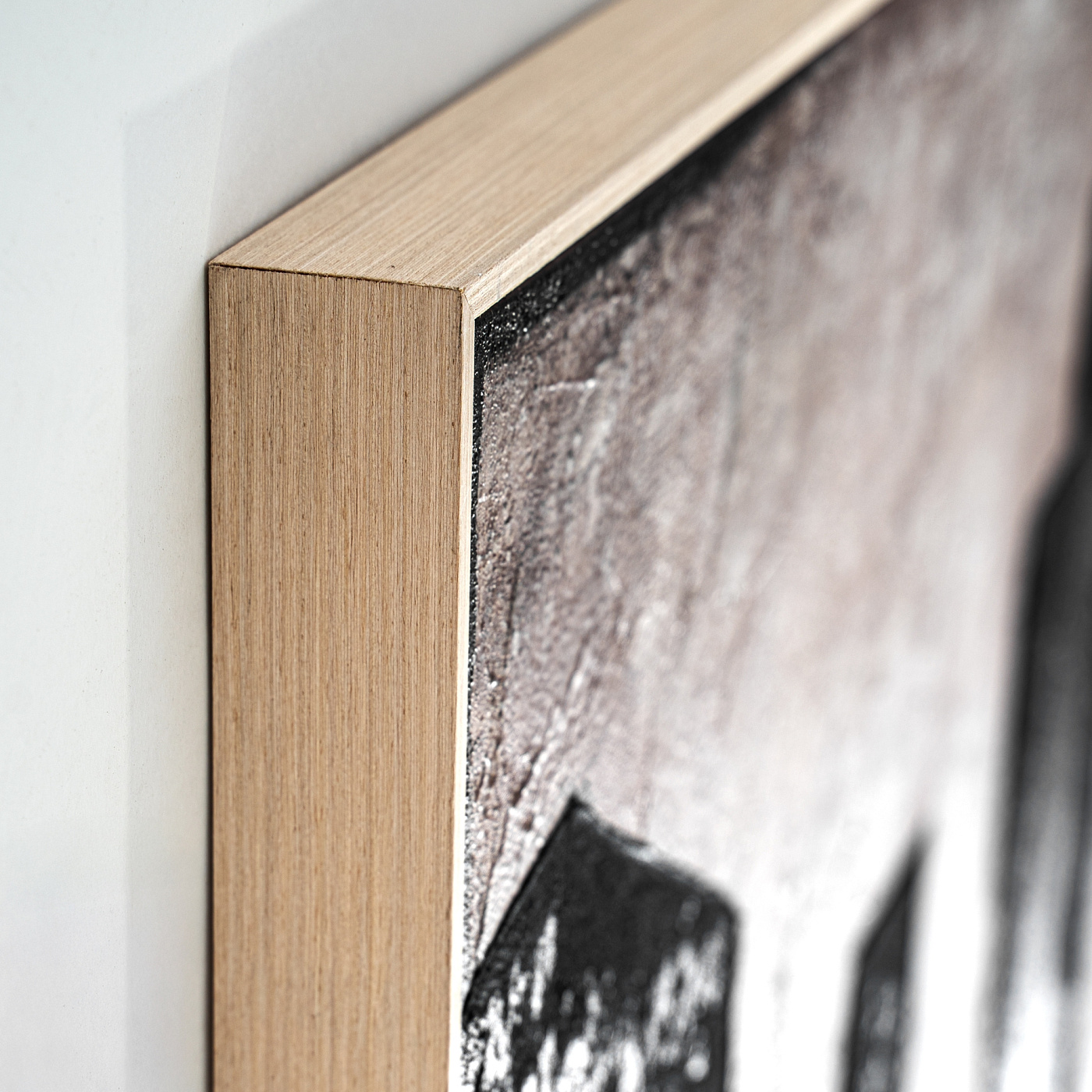 Картина Kurt в современном стиле, выполнена на холсте в нейтральных тонах в сочетании с коричневой сосновой древесиной. Ширина: 130 см, Глубина: 5 см, Высота: 180 см