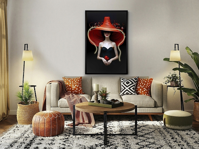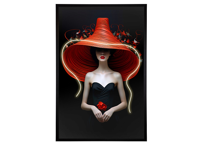Дама в головном уборе, композиция с декоративной светодиодной лентой. Печатный холст, наклеенный на доску и оформленный в черную раму. Соединительная коробка на задней стороне полотна. Вилка в комплект не входит.