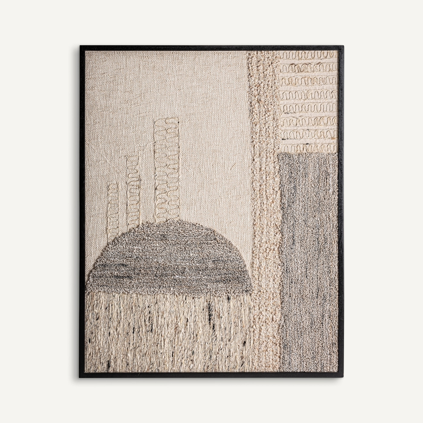 Современная картина в стиле «Урзури», выполненная из джута нейтральных тонов в сочетании с хлопком и манговым деревом черного цвета. Ширина: 120 см, Глубина: 4 см, Высота: 150 см