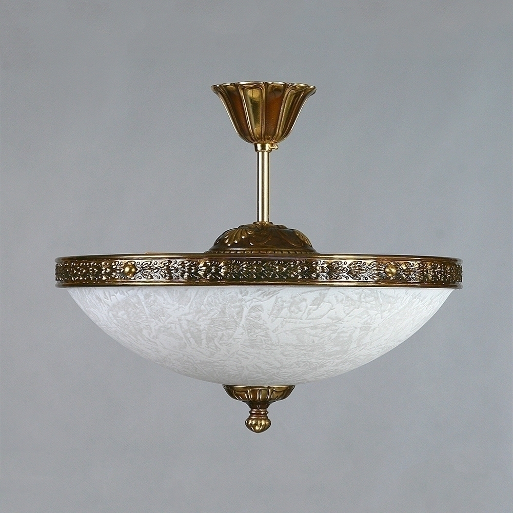 Потолочный светильник, выполненный из латуни в блестящей бронзовой отделке и плафоном из белого стекла.