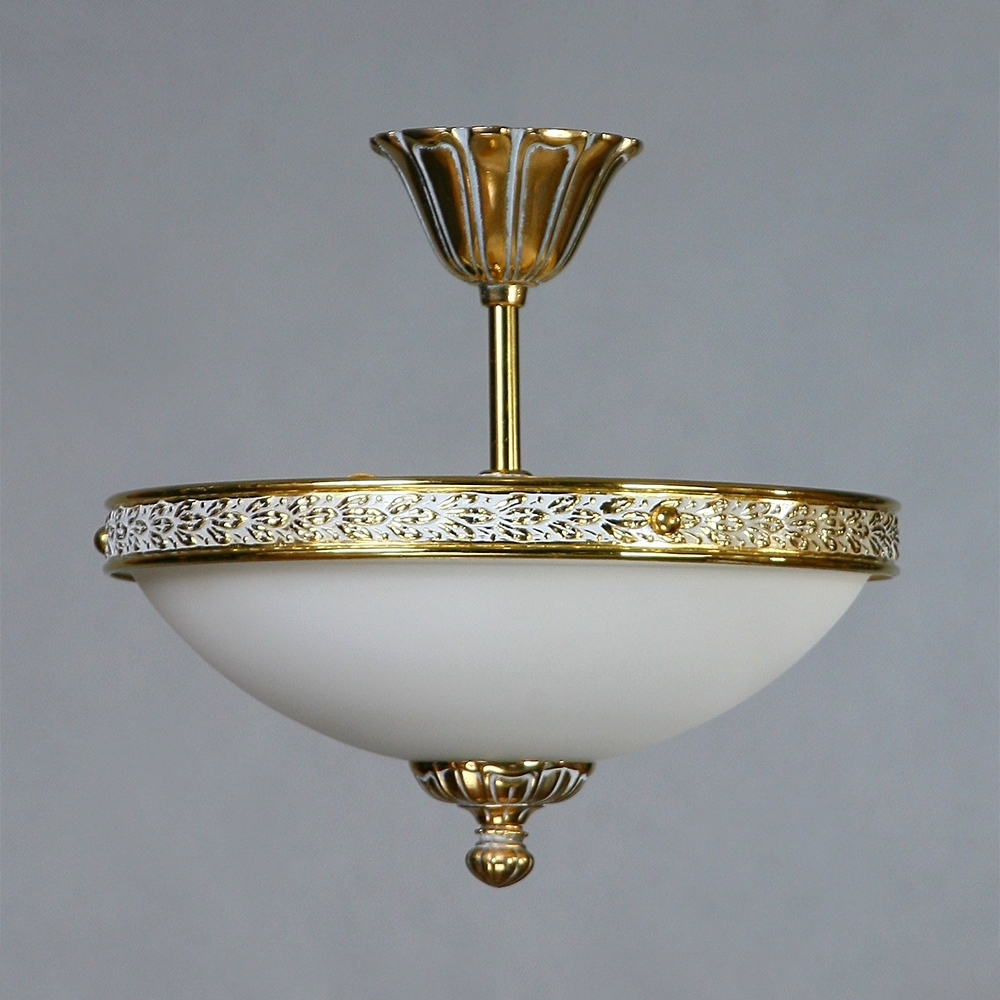 Потолочный светильник, выполненный из латуни в отделке "белая патина" с плафоном из стекла белого цвета.