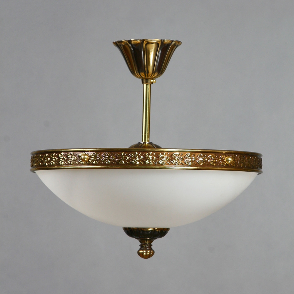 Потолочный светильник, выполненный из латуни в блестящей бронзовой отделке и плафоном из белого стекла.