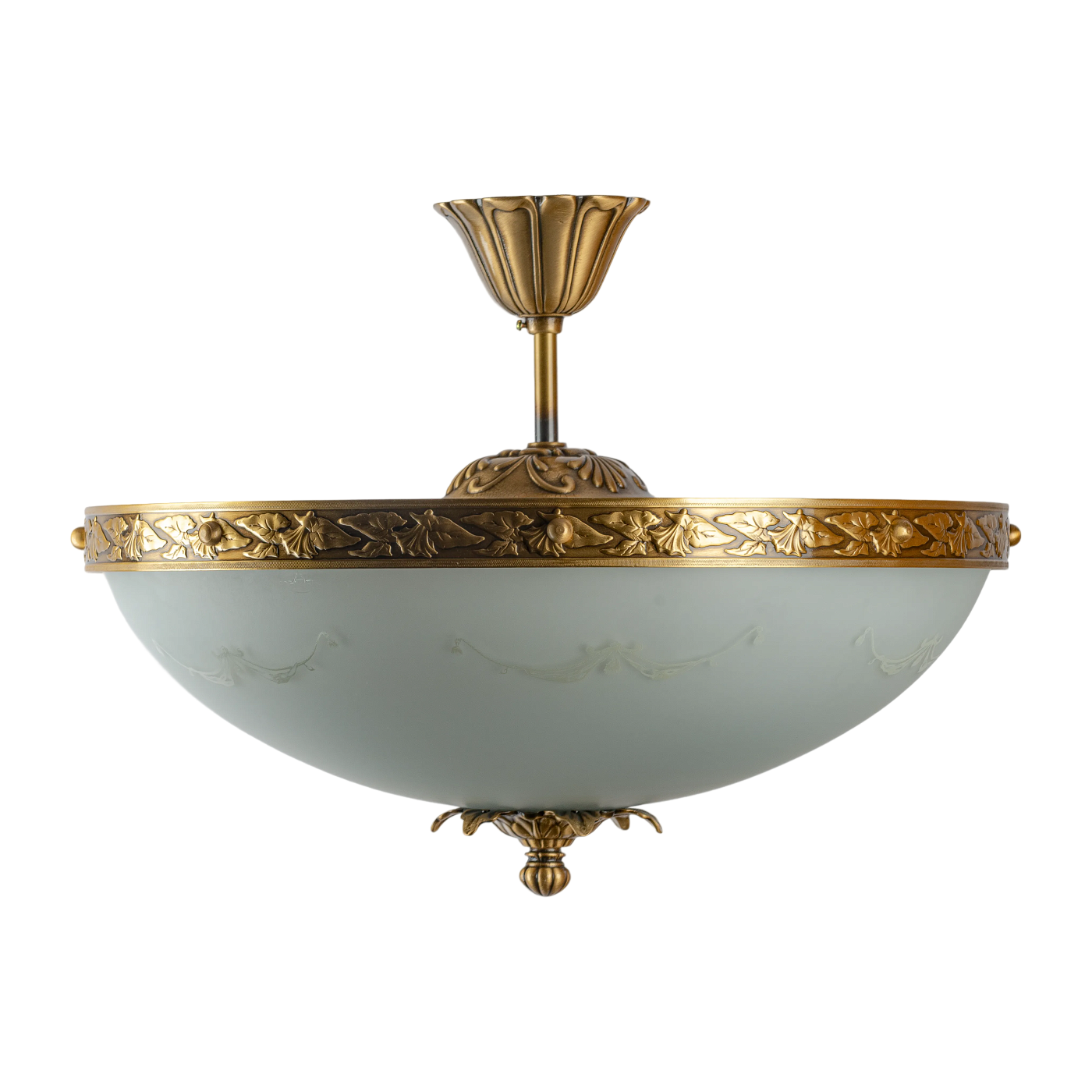 Потолочный светильник, выполненный из латуни в матовой бронзовой отделке и плафоном из белого стекла.