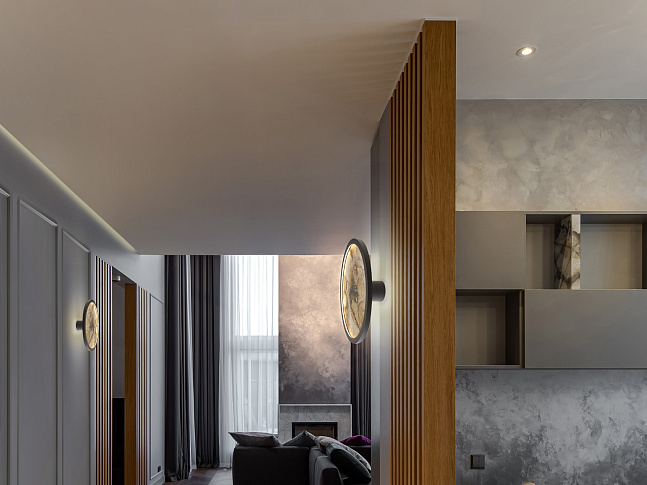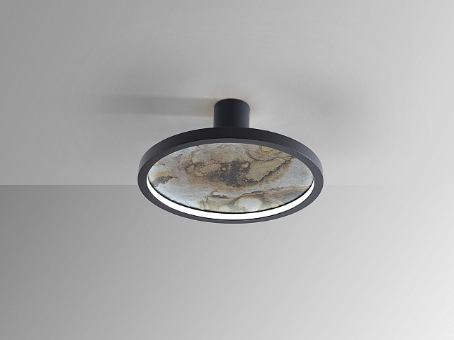 Круглый настенный светильник или потолочный светильник. Изготовлен из металла с черной отделкой и многоцветным сланцем, с опаловым акриловым кольцом. Светодиодный светильник 25 Вт, 334 лм, смена цвета CCT, 3000/4000/6000 К. Выбор цветовой температуры CCT осуществляется с настенного переключателя последовательными нажатиями клавиш. Включена функция памяти.