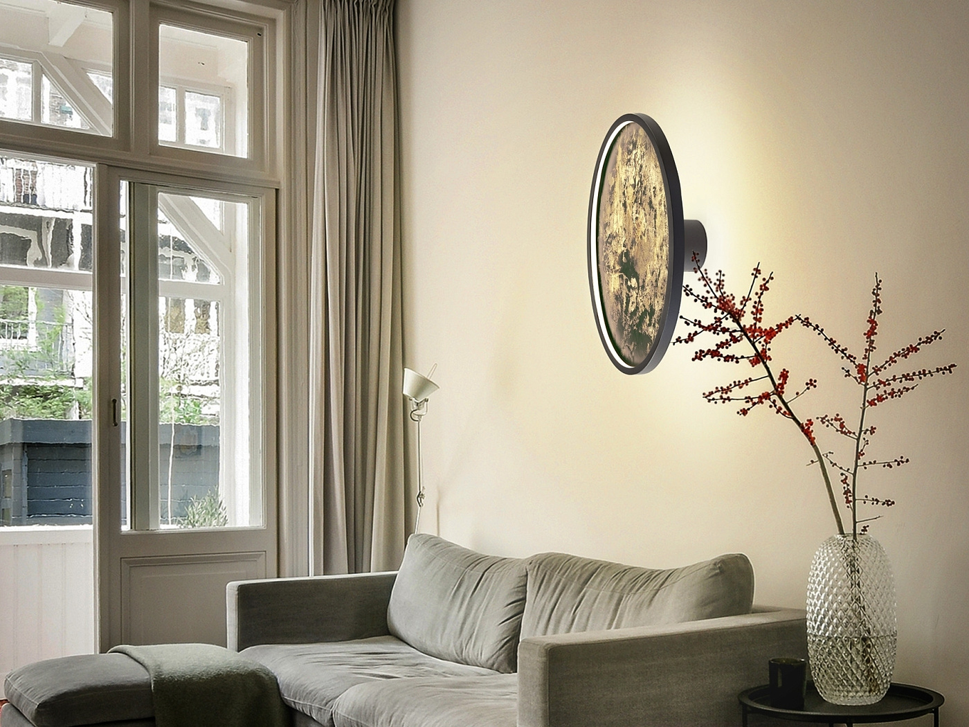 Круглый настенный светильник или потолочный светильник. Изготовлен из металла с черной отделкой и многоцветным сланцем, с опаловым акриловым кольцом. Светодиодный светильник 55 Вт, 495 лм, смена цвета CCT, 3000/4000/6000 К. Выбор цветовой температуры CCT осуществляется с настенного переключателя последовательными нажатиями клавиш. Включена функция памяти.